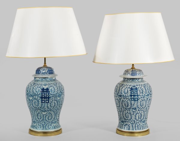 A pair of lidded blue and porcelain vases mounted as lamps.