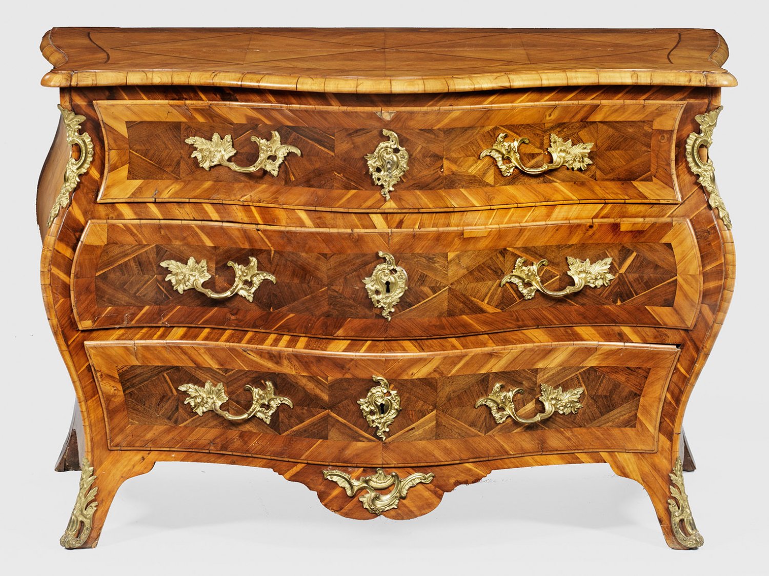 Pflaumenholz, Palisander und Rüster, furniert. Dreiseitig stark bombierter Korpus, flankiert von schmalen, weit ausgezogenen und gerundeten Ecklisenen, in ausgestellte Beine übergehend. In der gegliederten Front drei breite Schubladen. Gering überstehende, profilierte Deckplatte. Flächendeckend breit gerahmte, rautenförmige Furnierfelder. Applikationen aus vergoldeter Bronze. H. 76 cm. 114 cm x 56 cm.