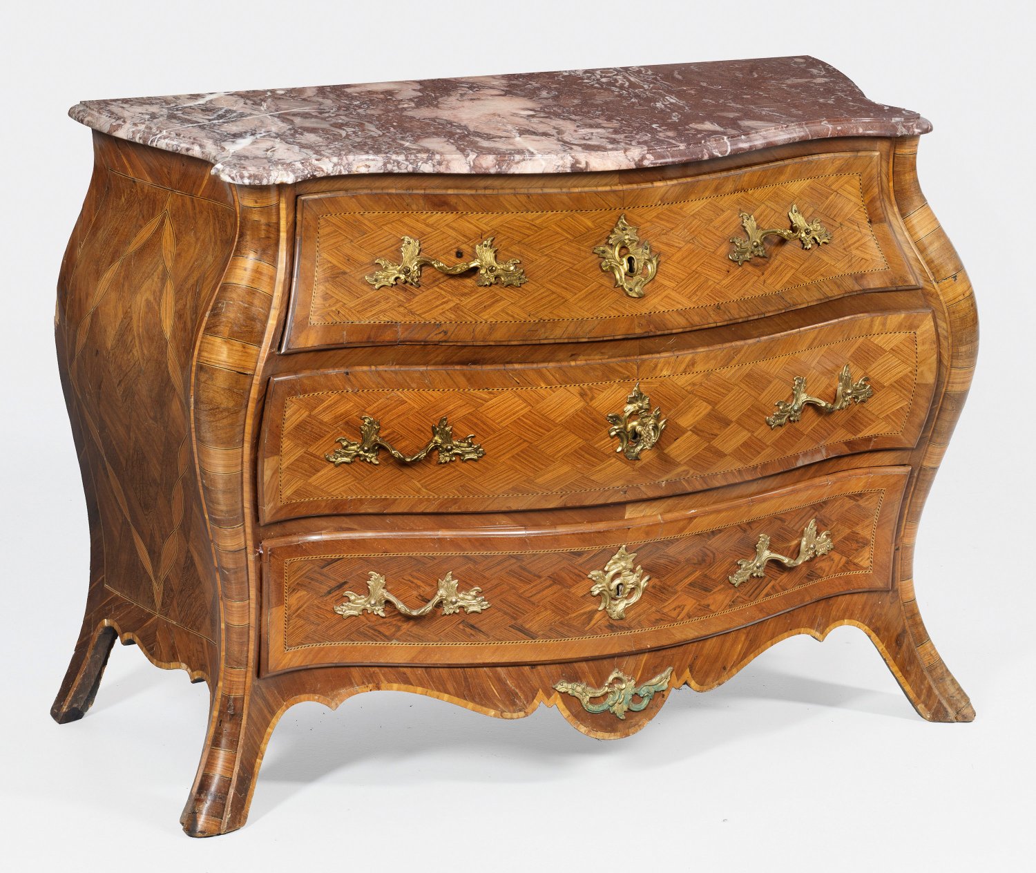 Nussbaum und Rosenholz, furniert. Dreiseitig stark bombierter Korpus mit passig geschweifter Zarge, flankiert von dick gewulsteten, weit ausgezogenen Ecklisenen. In der gegliederten Front drei breite Schubladen. Flächendeckend breit gerahmte Furnierfelder aus Rautenmarketerie, von feinen, schattierten Bandeinlagen begrenzt. Blattreliefierte Griffe aus vergoldeter Bronze. Profilierte Deckplatte aus rosérot gemasertem Marmor, rest.; H. 82,5 cm. 108 cm x 55 cm.