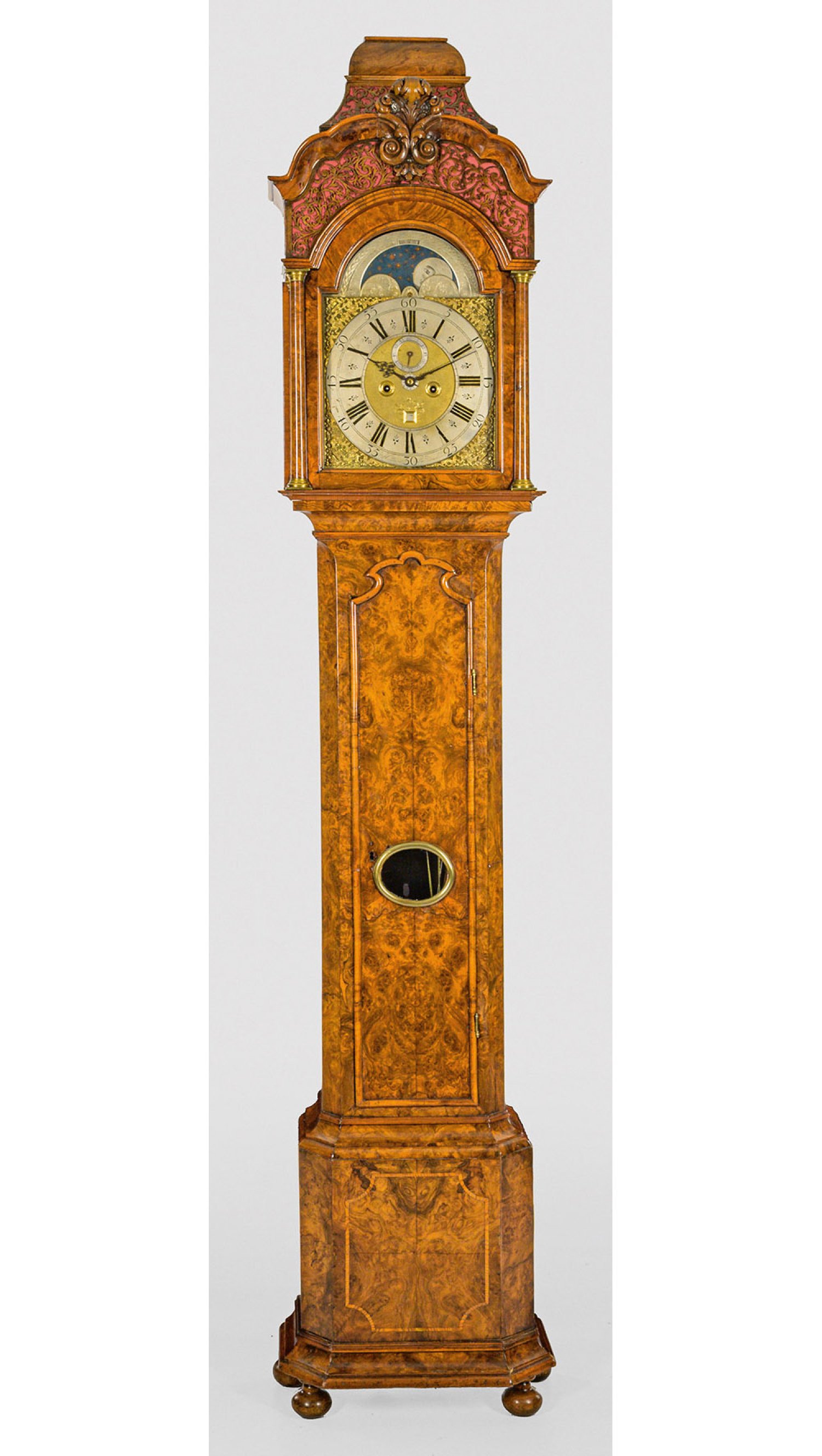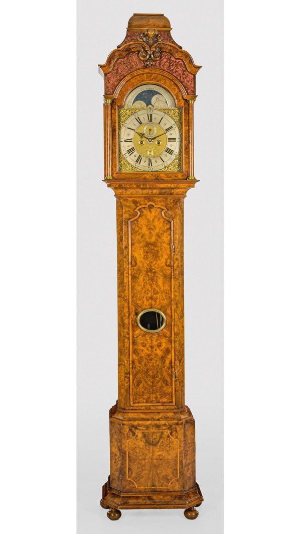 Nussbaum und Nussbaummaser, furniert. Über profiliertem Podestsockel eintüriger Korpus mit Pendelfenster, flankiert von schräggestellten Lisenen. Oberhalb eintürig verglaster Uhrenkopf mit reichem Dekor aus durchbrochen gearbeiteten Voluten und geschweift ansteigendem oberen Abschluss. Ornamentiertes Zifferblatt mit aufgelegtem Ziffernring, kleiner Sekunde, Datumsanzeige und Mondphase, bez. Hermanius Reynders Arnhem. Werk mit Ankerhemmung sowie Schlagwerk auf zwei Glocken. H. 245 cm.