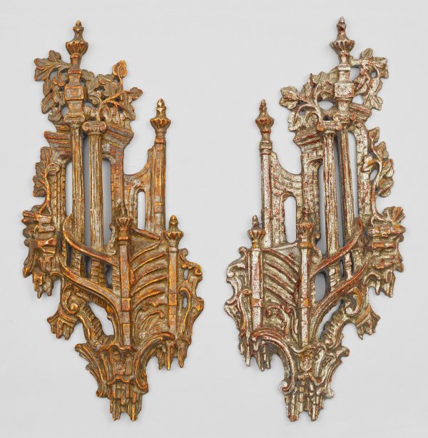 Gegenstücke. Holz, geschnitzt, gefasst und teilw. versilbert. Durchbrochen gearbeitete Wandschilder aus architektonischen Versatzstücken eines Palazzos wie Treppenanlagen, Balustraden und ionischen Säulen sowie C-Bögen, reliefplastischem Muschelwerk und großen Blattranken. H. 63 cm.