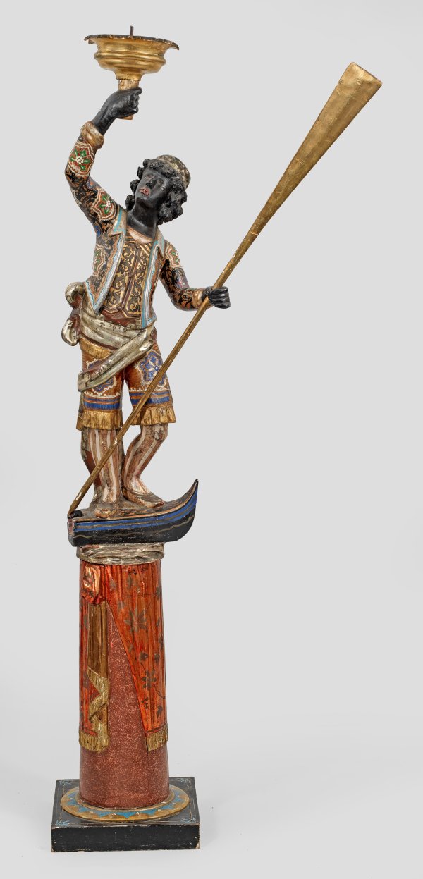 Holz, geschnitzt, ebonisiert, polychrom gefasst und teilw. vergoldet bzw. versilbert. Über quadratischer Plinthe zylinderförmiger Schaft in Porphyroptik, umgeben von üppigem Draperiewerk. Oberhalb vollplastische Darstellung eines venezianischen Mohren als Gondoliere mit reich ornamentierter Kleidung und einem vergoldeten Riemen auf einer kleinen Gondel stehend. In der emporgehaltenen Hand gedrückter Vasenkorpus, ehemals als Träger für Leuchtmittel. H. 188 cm.