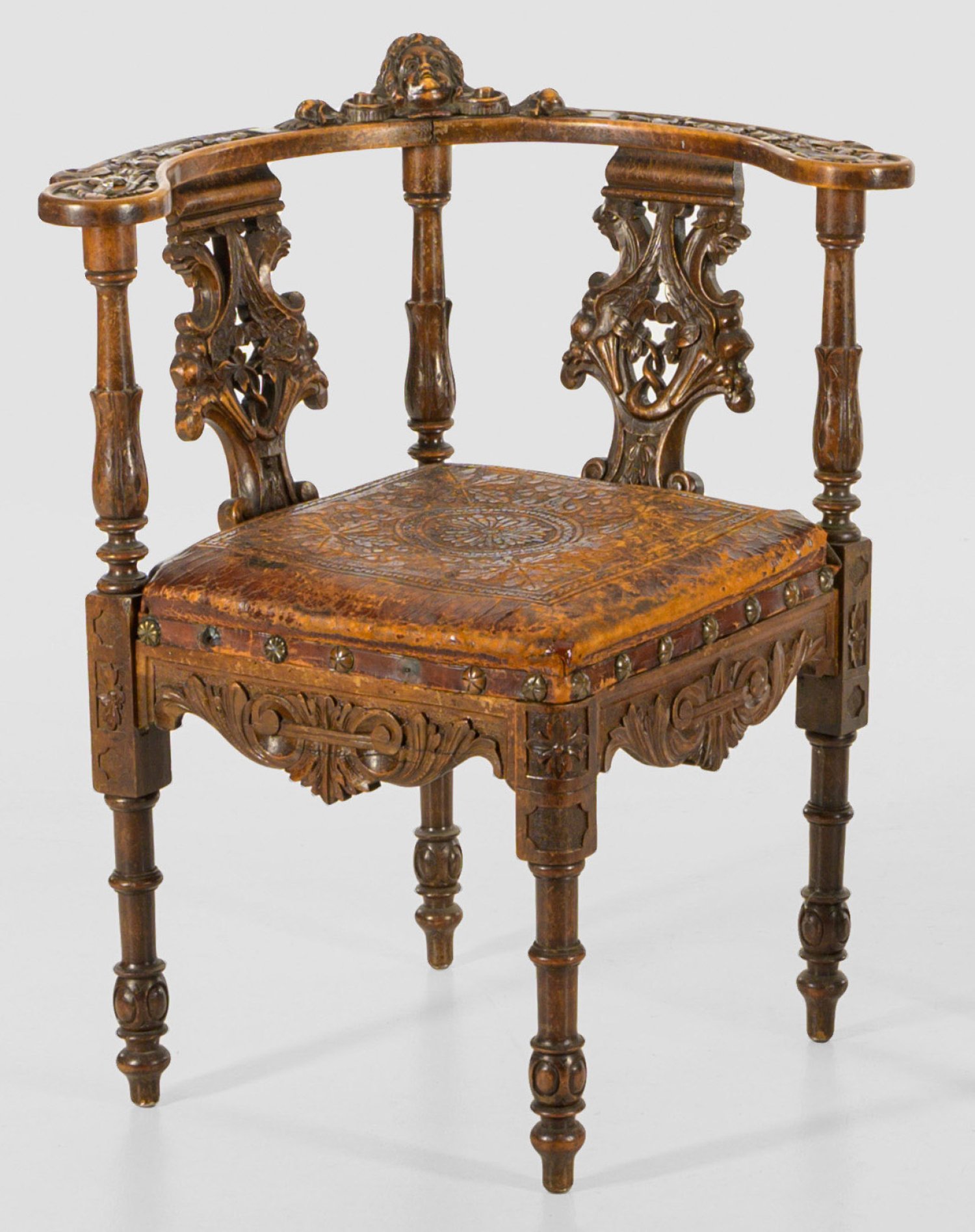 Nussbaum, reliefplastisch geschnitzt. Gerade, passig geschweifte Zarge aus Volutenmotiven auf gegliederten Balusterbeinen. Korrespondierende Streben sowie durchbrochen gearbeitete Balusterelemente für stark gebogte Lehnenrahmung mit reliefplastischem Puttenkopf. Sitzfläche gepolstert und mit originalem, geprägten Leder bezogen. Sitz-H. 43 cm.