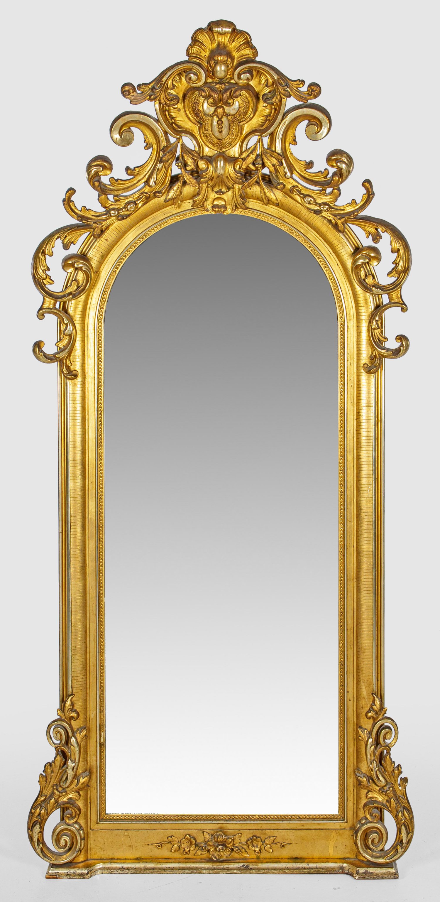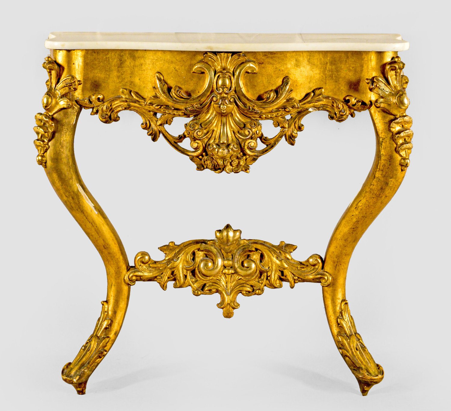 Holz, stuckiert, gefasst und vergoldet. Passig geschweifte Zarge mit großem Kartuschenmotiv aus Blattwerk auf stark geschwungenen Beinen, unterhalb durch korrespondierenden Steg verbunden. Deckplatte aus weißem Marmor. H. 79 cm. 80,5 cm. x 32 cm; Hochrechteckige Spiegelrahmung mit schmalem Schuppenfries. Hohe, vorkragende, durchbrochen gearbeitete Bekrönung aus zentraler Kartusche, umgeben von üppigen, eingerollten Blattvoluten. H. 181 cm x 77 cm.