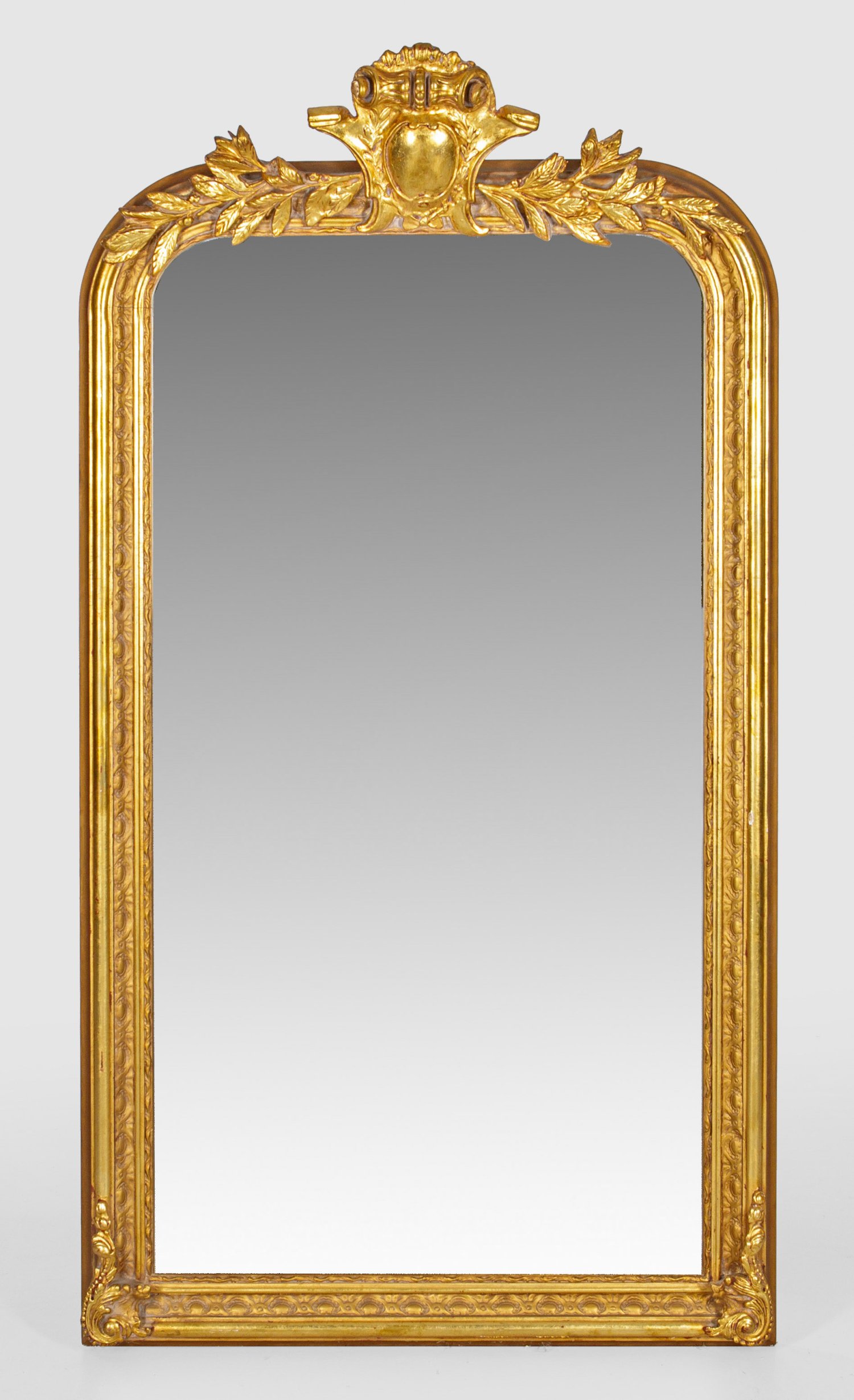 Holz, reliefiert und vergoldet. Hochrechteckige, profilierte Spiegelrahmung mit gerundetem oberem Abschluss. Vorkragende Bekrönung aus zentraler Kartusche, flankiert von üppigem Blattwerk. Facettiertes Spiegelglas. 164 cm x 90 cm.