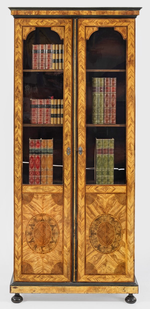 Nussbaum, furniert sowie teilw. ebonisiert. Gerader hochrechteckiger Korpus auf schmaler Profilzarge und gedrückten Füßen. In der gegliederten Front zwei hohe Vitrinentüren. Schmales Profilgesims als oberer Abschluss. Innen variable Einlegeböden und flaches Schubfach. Flächendeckend breit gerahmte, gespiegelt angeordnete Furnierfelder, teilw. in Form von Rauten oder Tondi, von Bandeinlagen begrenzt. H. 196 cm. 89 cm x 44 cm.