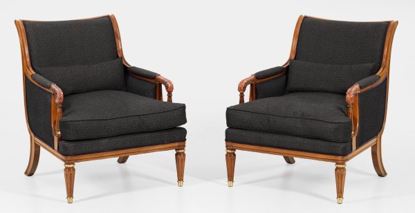 Helles Mahagoni, teilw. vergoldet. Schmale, trapezförmige Zarge auf kannelierten Beinen. Korrespondierende Stütze für geschweift ansteigende Armlehnen mit Akanthusdekor, in zurückschwingende Rückenlehne übergehend. Allseitig gepolstert und bezogen. H. 86,5 cm. 70 cm x 72 cm. Sitz-H. 41 cm.