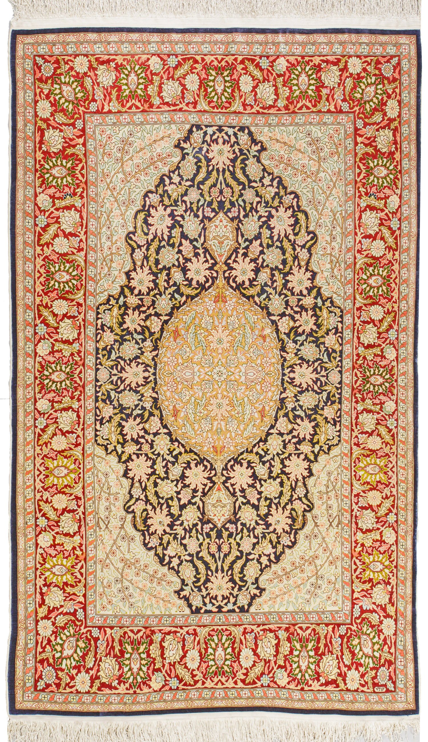Türkei. Seide auf Seide. Feine Knüpfung. Im dunklen Innenfeld getrecktes Zentralmedaillon mit Anhängern sowie breite elfenbeinfarbene Ecklösungen. Flächendeckende Musterung aus dicht angeordneten Palmetten und Blütenzweigen. Umlaufend breite, rotgrundige Palmettenbordüre, flankiert von schmalen Bändern. Sign.; 177 cm x 107 cm.