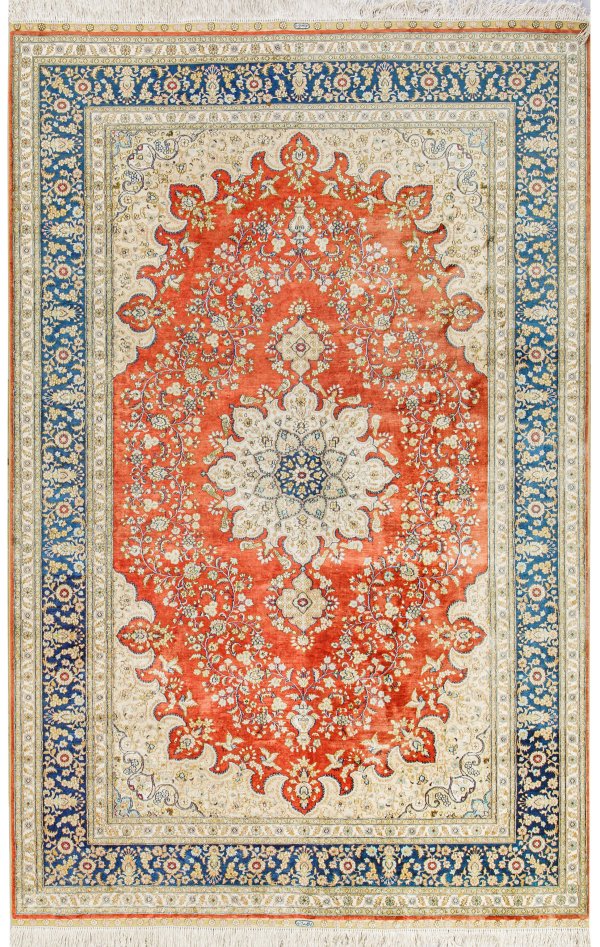 Türkei. Seide auf Seide. Im hellroten Innenfeld großes, cremefarbenes Zentralmedaillon mit Anhängern, umgeben von breiter Blütenrahmung sowie passig geschweiften Ecklösungen. Umlaufend blaue Bordüre aus Palmettenranken und Blütenrosetten, flankiert von hellen Bändern. Sign.; 242 cm x 156 cm.