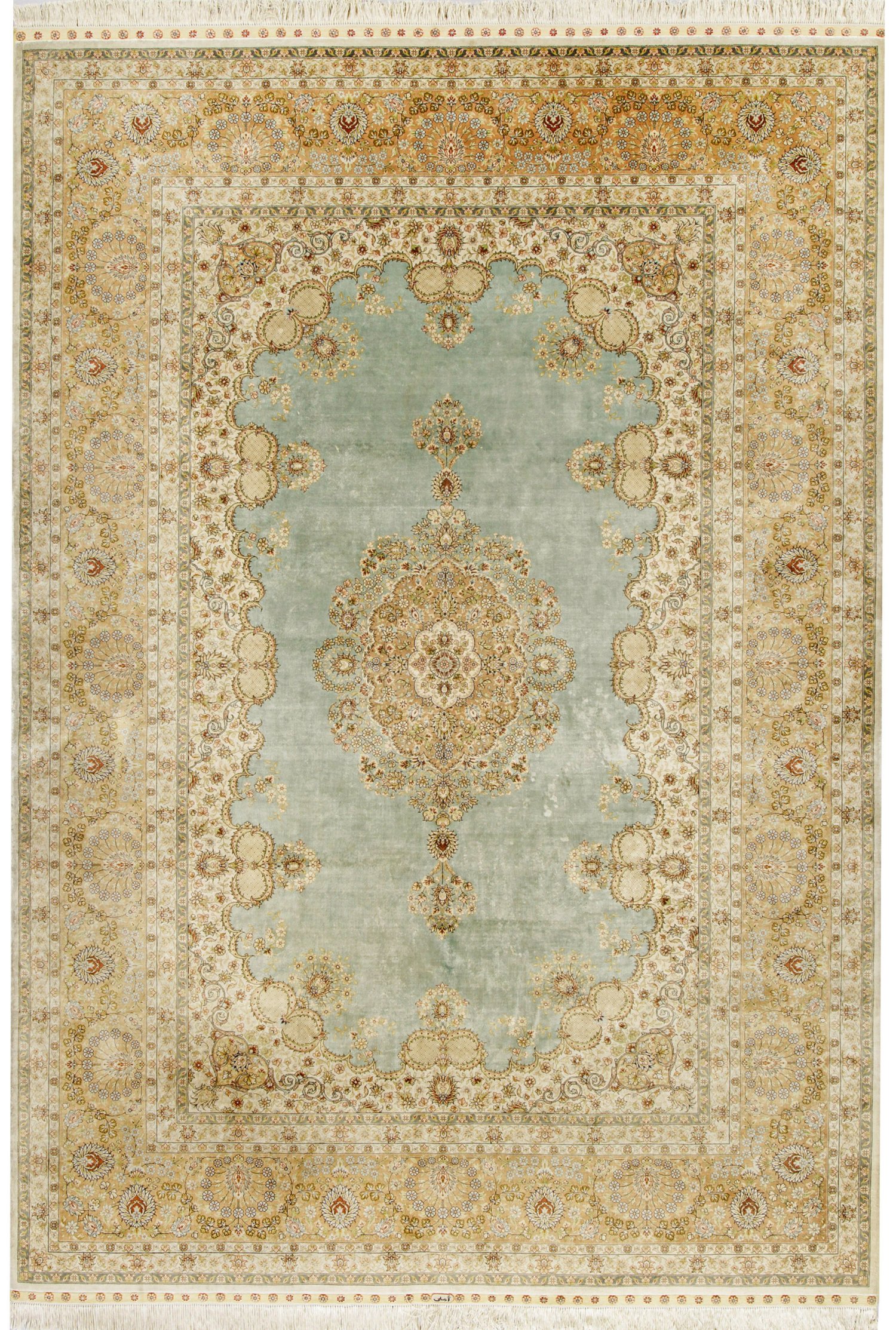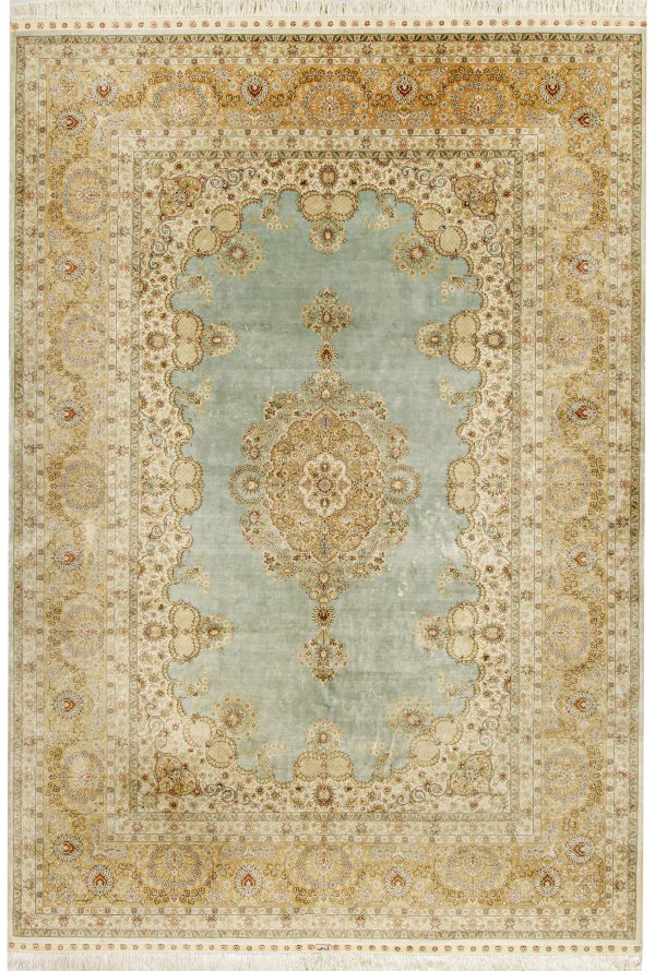 Türkei. Seide auf Seide, feine Knüpfung. Im hellblauen Innenfeld von Blüten umgebenes Zentralmedaillon mit Anhängern sowie korrespondierende, cremefarbene Ecklösungen. Umlaufend breite Bordüre aus gereihten Blütendolen, flankiert von mehreren Nebenbordüren. Sign.; 277 cm x 186 cm.