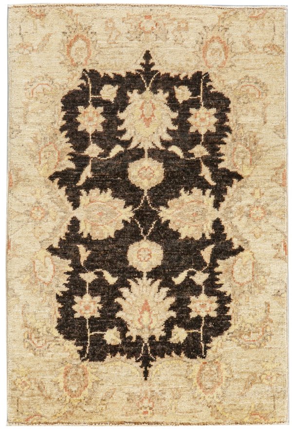 Afghanistan. Wolle auf Baumwolle. Im schwarzen Innenfeld großzügig angelegte Musterung aus großen Palmettenblüten. Umlaufend breite, beigefarbene Bordüre mit korrespondierender Musterung. 93 cm x 63 cm.