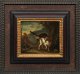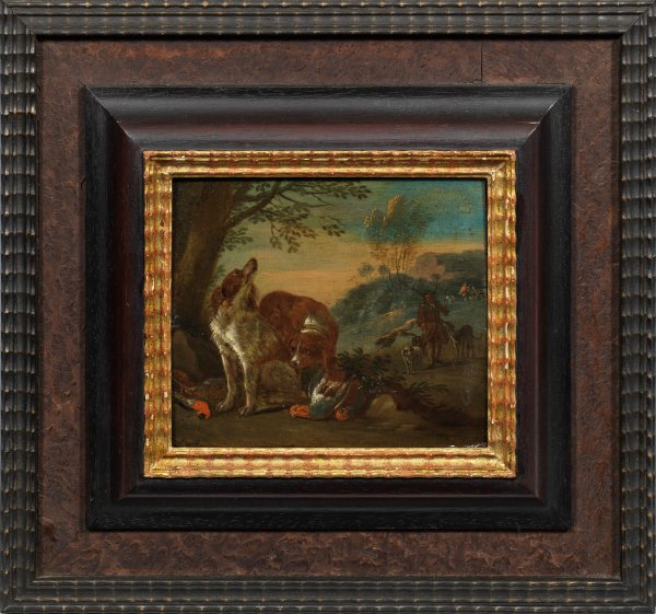 Gegenstücke. Beute bewachende Jagdhunde dargestellt in stimmungsvollen, abendlichen Landschaften, im Hintergrund belebt durch Jäger mit ihrer Meute bzw. bei der Rast. Das fein gemalte Gemäldepaar weist in Stil und Motiv evidente Parallelen zu Werken de Gryeffs auf und kann somit dem Umkreis des flämischen Jagd- und Stilllebenmalers zugeordnet werden, der 1687 Meister in Gent wurde und hauptsächlich in Brüssel und Antwerpen arbeitete. Öl/Eichenholztafel. 14,3 cm x 16,5 cm bzw. 14 cm x 16,7 cm. Rahmen.