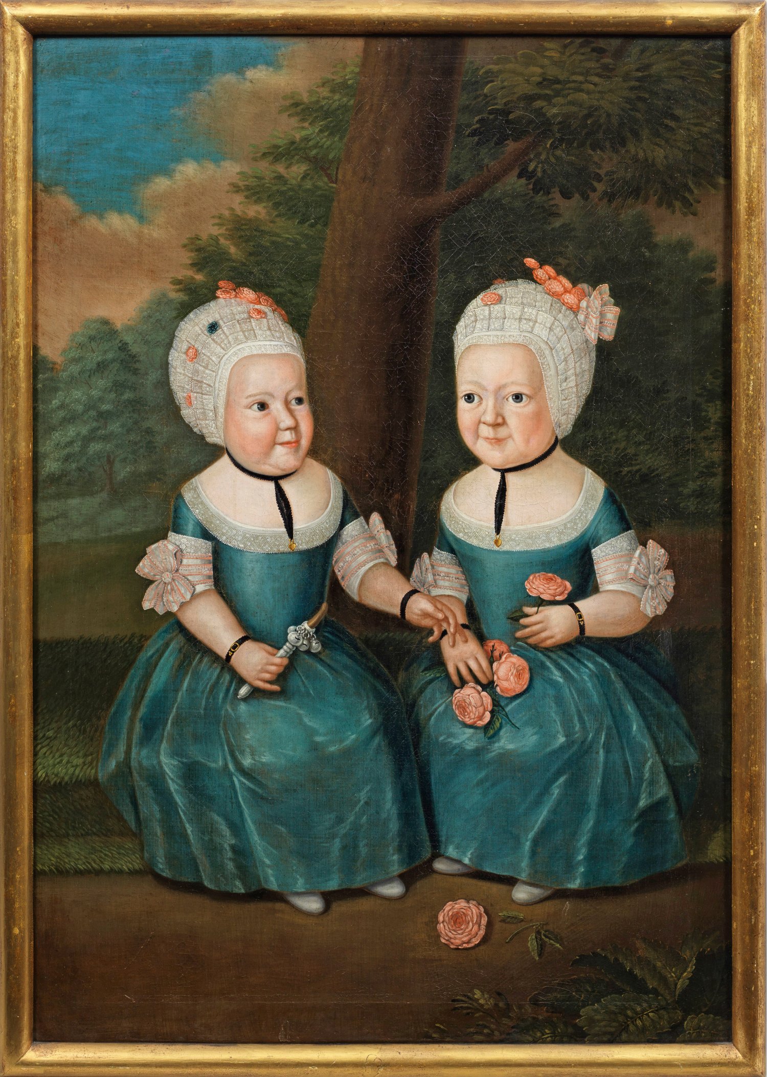 Ganzfiguriges, seltenes, reizvolles, authentisches Rokoko-Kinderbildnis, welches die Mädchen in höfischer Tracht sitzend im Garten darstellt, einen Glöckchenstab und Rosenblüten in den Händen haltend. Öl/Lwd. 109 cm x 77 cm. Original-Rahmen.