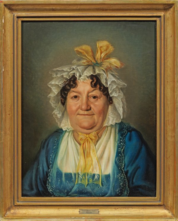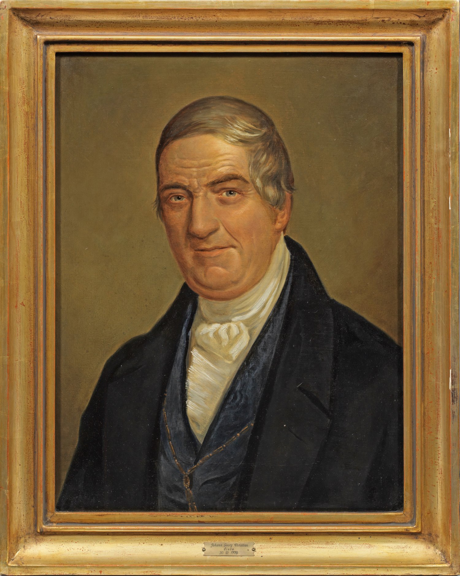 Fein gemaltes, biedermeierliches Porträt einer reifen Dame (auf der Rahmenplakette bez. "Tante Marie-Sophie Ehlicker"). Außerdem Bildnis eines wohlhabenden Herren im schwarzen Gehrock, mit dunkelblauer Weste und weißem Plastron (auf der Rahmenplakette bez. "Johann Georg Christian Liebe 30.12.1779). Öl/Lwd. doubl.; 54 cm x 42 cm. Rahmen.