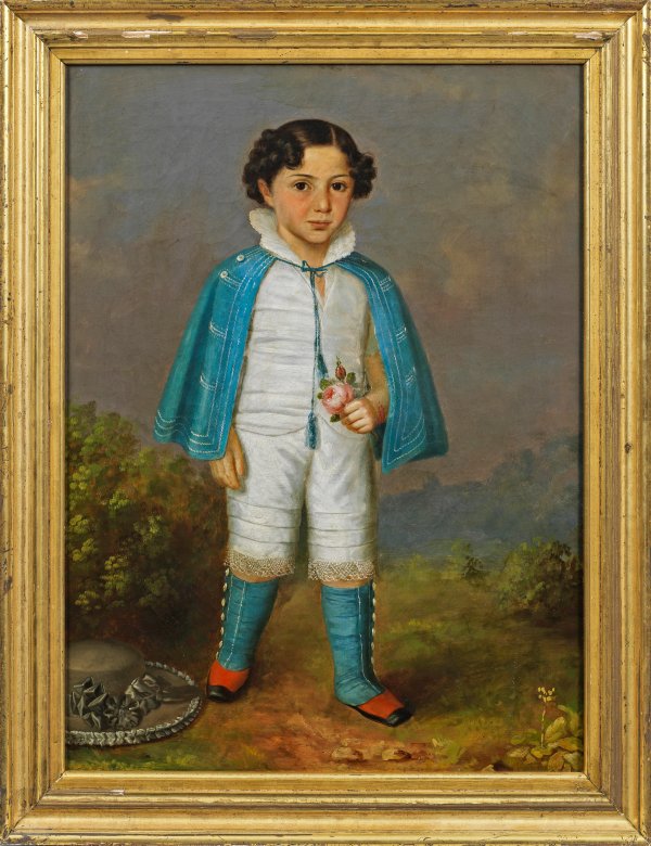 Vor vegetabilem Hintergrund gemaltes, ganzfiguriges Bildnis eines Knaben in zeittypischem Kostüm mit Gamaschen, auf dem Boden links im Vordergrund ein breitkrempiger Hut mit Rüschenapplikationen. Feinmalerische, zart kolorierte und subtil charakterisierte Darstellung in der Tradition der Wiener Bildnismaler wie Friedrich von Amerling, Franz Eybl, Franz Schrotzberg und Johanna Fischer. Öl/Lwd. (Malwarenstempel W. Coller & C. Wien); 71 cm x 53,5 cm. Rahmen.