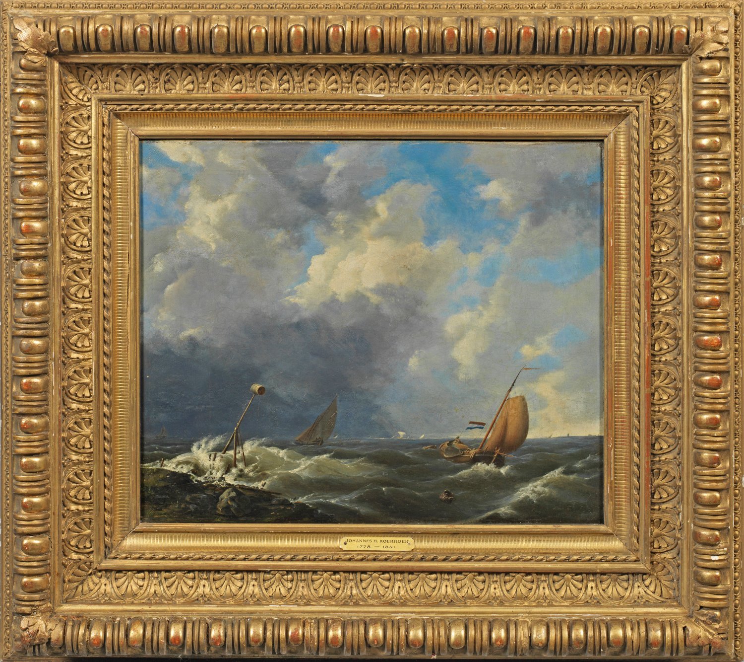 Blick auf das Meer mit Schiffen unter hohem Himmel, im Vordergrund anbrandende Gischt. In Motiv, Komposition und Stil für das Oeuvre des Künstlers repräsentatives, atmosphärisch gestimmtes Marinebild. Dieser wird bis heute für seine präzise bis ins Detail gemalten Schiffe, meisterhaften Wolkenhimmel und Schilderungen des Meeres mit seinen Wellenbildungen gleichermaßen gerühmt. Hermanus Koekkoek stammte aus einer bedeutenden Künstlerfamilie, sein Vater und Lehrmeister war der Marinemaler Johannes Hermanus Koekkoek (1778 - 1851), sein älterer Bruder der Landschaftsmaler Barend Cornelis Koekkoek (1803 - 1862). Seit 1834 war er in Amsterdam und zeitweilig in seinen Vororten tätig, 1840 nahm ihn die Königliche Akademie der Bildenden Künste in Amsterdam als Mitglied auf. Werke Koekkoeks befinden sich in verschiedenen niederländischen Museuen in Amsterdam, Delft, Groningen, Haarlem und Rotterdam. Öl/Lwd., doubl.; L. u. undeutl. monogr.; 34,5 cm x 41 cm. Rahmen.