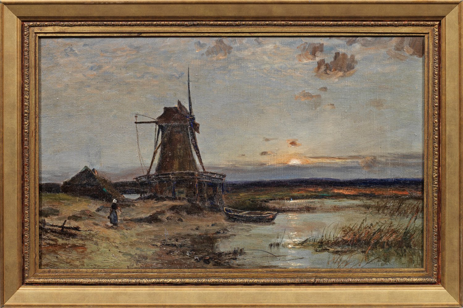Abendlich gestimmte, von den letzten Strahlen der untergehenden Sonne erhellte Landschaft. Mit weich pastosem Duktus gemalte Landschaftsimpression mit subtil eingefangenem Licht. Roelofs gilt als bedeutender Vorläufer der Haager Schule. Von der Romantik ausgehend, verband er in den Jahren 1847-1887 in Brüssel Einflüsse der Schule von Barbizon mit denen anderer fortschrittlicher Haager Künstler wie Johan Hendrik Weissenbruch. In den Jahren 1851, 1852 und 1856 reiste er selbst nach Barbizon und Fontainebleau. Ab 1856 begab er sich im Sommer regelmäßig in die Niederlande, wo er Motive in den Feuchtgebieten und Polderlandschaften fand. Öl/Lwd.; Verso auf einem Papieretikett bez. und betitelt. 36 cm x 57 cm. Rahmen.