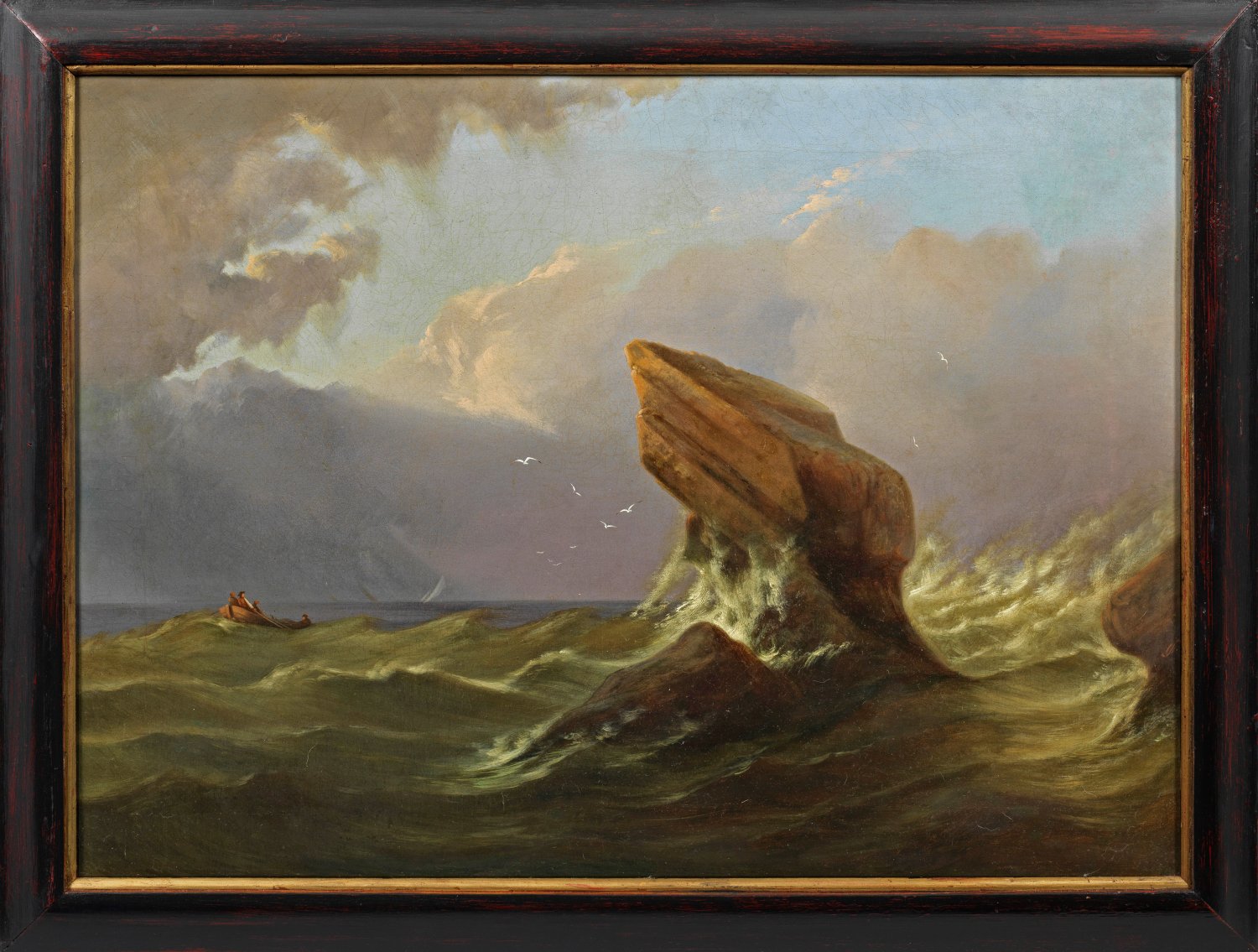 Atmosphärisch gestimmte Darstellung eines sich nähernden Ruderbootes aus der Sicht des Ufers, erkennbar gemacht durch scharfkantige Klippen auf der rechten Bildseite und weiße Möwen. Im Hintergrund ein von der stürmischen See gebeuteltes Segelboot, welches wohl den Ausgangspunkt des Ruderbootes mit vier Mann an Bord kennzeichnet. Öl/Lwd., doubliert. R. u. auf Stein monogr. "OS" (?) ; 60 cm x 82 cm. Rahmen.