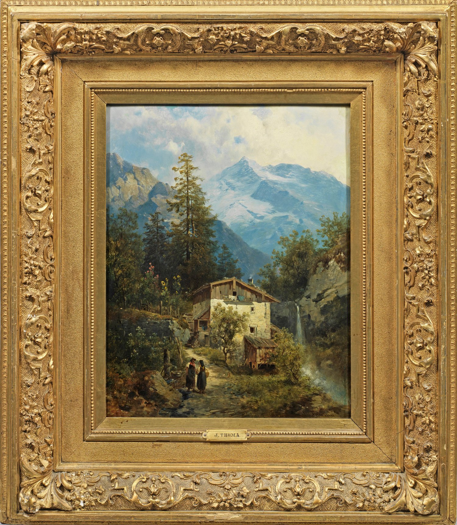 Spätromantische, sommerlich heitere Stimmungslandschaft mit Blick auf ein Tal mit Wasserfall, im Vordergrund zwei Frauen im Gespräch vor einem pittoresken alten Haus. Thoma, Sohn des gleichnamigen Malers Josef Thoma Senior, studierte an der Akademie und fand die Motive für seine Alpenlandschaften mit Vorliebe auf Reisen ins Pustertal, Steyrtal, Zillertal, Salzkammergut und Berner Oberland. Öl/Holztafel. R. u. sign.; Verso auf altem Etikett betitelt "Motiv aus dem bairischen Hochgebirge"; Etikett der Galerie Erich Beckmann, Hannover. 52,5 cm x 42 cm. Wohl Original-Rahmen.