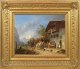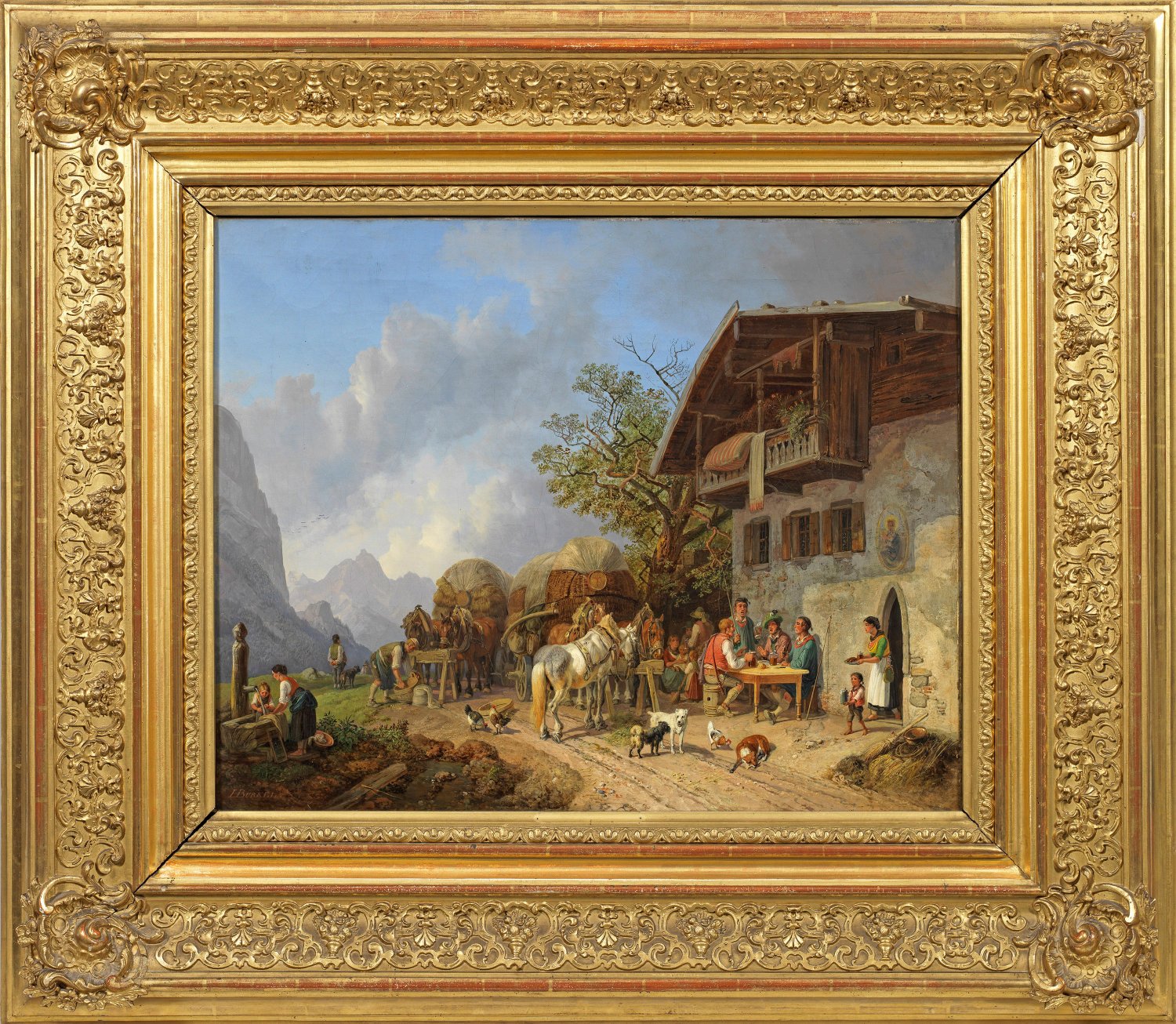 Um 1845-1850 entstandenes, feinmalerisch ausgeführtes Werk, wohl ein Motiv im Wettersteingebirge bei Garmisch-Partenkirchen. Geschildert wird episch und in mehreren Einzelszenen, die den Blick über das Gemälde wandern lassen, wie zwei Fuhrwerke Rast an einem ländlichen, pittoresken Wirtshaus machen, die Pferde gefüttert werden und den fröhlich singenden Fuhrleuten Brot und Bier gebracht wird. Im Vordergrund tummeln sich Hühner und verschiedene Hunde, während der Hintergrund von einer atmosphärisch gestimmten Alpenlandschaft unter duftig bewölktem Himmel bestimmt wird. Für Bürkel charakteristische, motiv- und stiltypische Darstellung des Landlebens, die sich durch liebevolle Darstellung der topographischen Details sowie der Figuren und Tiere im warmen Licht der Sonne auszeichnet. Bürkel, der sich vor allem in der Gattung der sog. Genrelandschaft einen Namen machte, wurde 1824 Gründungsmitglied des Münchener Kunstvereins. Hauptsujet Bürkels waren bäuerliche Szenen aus dem Volksleben, die er in ländliche Umgebungen Oberbayerns und Italiens einbettete. Insgesamt viermal (1827, 1830, 1837 und 1853) reiste er nach Italien (u. a. Rom, Tivoli, Campagna und Venedig) und blieb teilweise bis zu zwei Jahre dort; andere Studienreisen führten ihn nach Tirol (darunter Rattenberg), in die Umgebung von München, durch die Bayerischen Voralpen und Oberbayern: an den Tegernsee und Starnberger See, zur Benediktenwand bei Benediktbeuern, in das Inntal, nach Garmisch-Partenkirchen, Ramsau bei Berchtesgaden, zur Zugspitze etc.; Ausstellungen in München, Dresden und Berlin sowie die Weltausstellungen in London 1862 und Paris 1867 machten ihn weithin bekannt und international begehrt. Öl/Lwd.; L. u. sign.; 42,5 cm x 53,5 cm. Original-Prunkrahmen.
