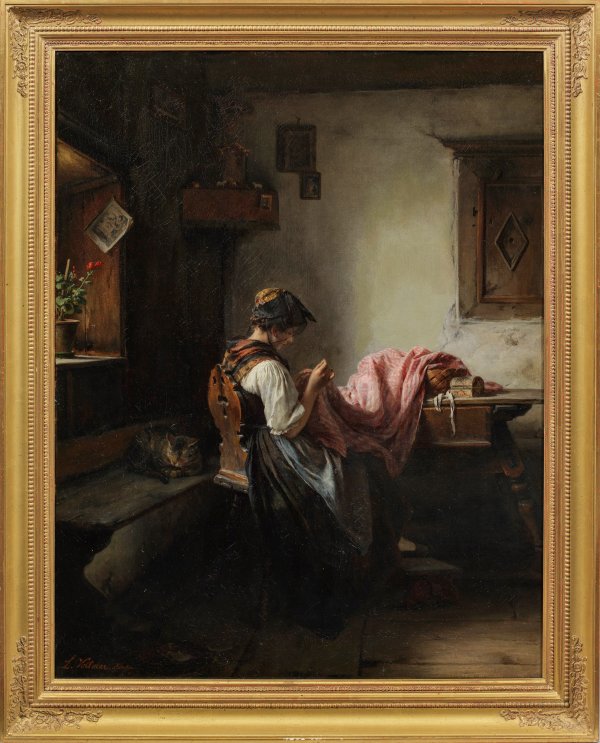 In der Stube eines oberbayerischen Bergbauernhofes sitzendes Mädchen bei der Näharbeit, hinter ihr eine auf einer Bank schlafende Katze. Sehr stimmungsvolle, heimelige Darstellung in nuancenreichem Kolorit, meisterhaft in der Wiedergabe des Stofflichen und der effektvollen Lichtführung. Charakteristische Genreszene des bedeutenden Münchener Malers. Vollmar studierte seit 1858 an der Münchener Akademie bei Johann Georg Hiltensperger und Hermann Anschütz, er besuchte die sog. "Componirschule" bei Philipp Foltz und ein Semester die Kunstakademie Karlsruhe, ging aber wieder nach München zurück, wo er 1866-1870 seine künstlerische Ausbildung bei Arthur von Ramberg vollendete. Öl/Lwd., doubl.; L. u. sign. mit Ortsangabe München. 92,5 cm x 73,5 cm. Rahmen.