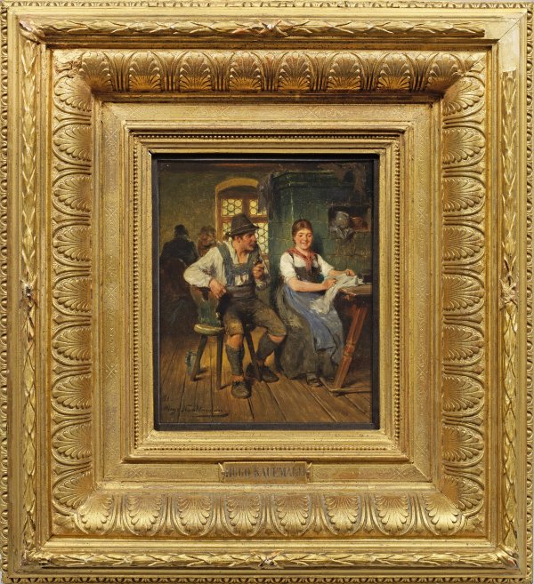 Pfeife rauchender Bauersmann in oberbayerischer Tracht, der jungen, ein Hemd flickenden Frau, Avancen machend. Fein gemaltes, charakteristisches Kabinettbild Hugo Kauffmanns, Sohn des bedeutenden Hamburger Genre- und Landschaftsmalers Hermann Kauffmann (1808 - 1889). 1861-1863 studierte er am Städel'schen Kunstinstitut in Frankfurt a. M. und war ab 1871 in München und Prien ansässig. In seinem Oeuvre zeigt sich besonders seine Begabung als herausragender Schilderer humoristischer, subtil beobachteter Szenen aus dem bayerischen Volksleben voll erzählerischer Kraft. Meist komponierte er diese in Wirts- und Bauernstuben mit feinem Gefühl für Details und Lichtstimmungen. Öl/Mahagonitafel. L. u. sign. und dat. (18)81. Verso mit ehemaligen Besitzvermerken auf Papieretiketten. 18 cm x 15 cm. Rahmen.