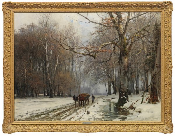 Stimmungsvolle, motiv- und stiltypische Winterlandschaft des dänischen Malers, der seit 1864 in Charlottenburg ausstellte und 1870 seine erste Winterlandschaft zeigte. 1876/77 wurde Andersen-Lundby in München ansässig, wo er als virtuoser "Schneemaler" mit seinen atmosphärisch gestimmten Winterlandschaften erfolgreich zunächst die Ausstellungen im Kunstverein beschickte, seit 1882 auch mehrfach die Ausstellungen im Glaspalast; überdies beschickte er die Akademie-Ausstellungen in Berlin (1886, 1892) und die Großen Berliner Kunstausstellungen (1895, 1898, 1904, 1906). 1899 erhielt Andersen-Lundby vom Prinzregenten Luitpold den Titel eines königl. Professors als Auszeichnung. Öl/Lwd., doubl.; R. u. sign. u. dat. 1882. 85,5 cm x 115 cm. Rahmen.
