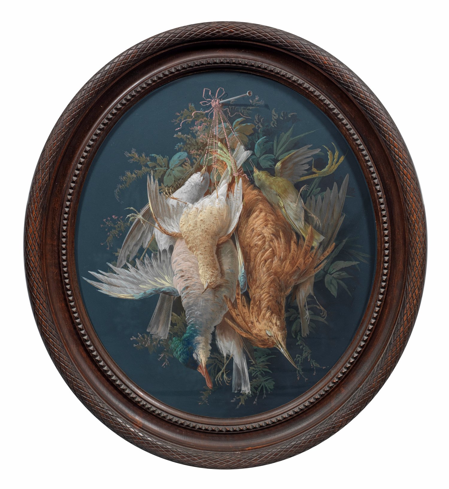 Austrian still life painter active 19th C.; A pair of oval still lifes with game birds. Gouache on cardboard. Original frame.