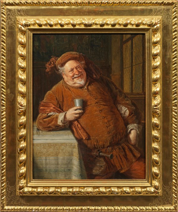 Darstellung des älteren, wohlbeleibten, genießerischen, trink- und raufsüchtigen Soldaten aus den Stücken von William Shakespeare, der hier lachend und mit einem Weinbecher an einem Tisch sitzend geschildert wird. Feinmalerisches, motiv- und stiltypisches Werk Grützners, der die Figur Falstaffs subtil und sympathisch charakterisiert, auch die Stofflichkeit virtuos wiedergibt. Nach seinem Akademiestudium bei Hermann Anschütz und Carl von Piloty 1865-1870 hatte Grützner rasch großen Erfolg und wurde zu einem der bedeutendsten und bis heute populärsten Münchener Genremaler. Hauptsujets Grützners waren Falstaff-Darstellungen, Kardinäle bei der Lektüre und als Sammler sowie heitere Motive aus dem klösterlichen Leben - Mönche, die sich sinnenfroh und ausgiebig irdischen Genüssen wie Essen und Trinken hingeben. Schon 1868 stellte Grützner ein erstes Falstaff-Gemälde in München und Wien aus, danach schilderte er Falstaff zeitlebens in immer wieder neuen Variationen. Öl/Lwd., doubl.; L. u. sign. u. dat. 1904. 50 cm x 40 cm. Rahmen.