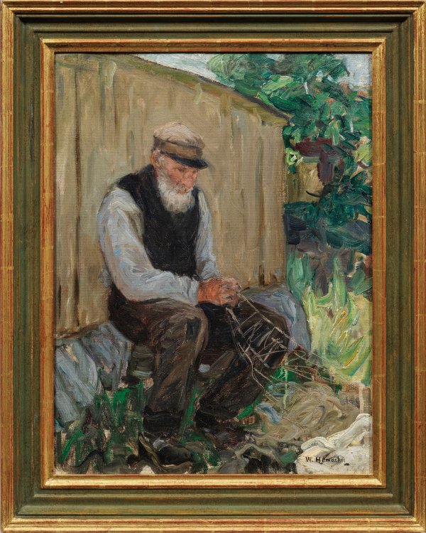 In lockerem Duktus gemalte, einfühlsam geschilderte Genreszene, die einen bärtigen Mann beim Flicken eines Netzes in einem angedeuteten Hinterhof darstellt. Hamacher studierte bei Dücker in Düsseldorf und war Meisterschüler Gudes in Berlin. Reisen führten ihn vor allem nach Italien, aber auch nach Paris, Rügen und Schweden. Anfangs schuf er auch nordische Landschaften, später spezialisierte er sich auf italienische Ansichten, besonders der Riviera. Öl/Lwd., doubliert. R. u. sign.; Verso sign. sowie betitelt mit Ortsangabe Schweden. Keilrahmen mit alter Ausstellungsnummer. 61 cm x 48 cm. Rahmen.