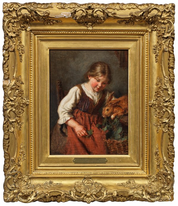 Stimmungsvolle, detail- und naturgetreu geschilderte Genreszene eines pausbackigen, glücklichen Mädchens mit einem Hasen. Schlesinger studierte an der Düsseldorfer Akademie bei Rudolf Jordan; 1862/63 ließ er sich in München nieder und beschickte bis 1908 mit Darstellungen ländlichen Lebens die nationalen und Wiener Ausstellungen. Öl/Holztafel. L. o. sign., verso altes Galerieetikett mit Künstlerbez., engl. Titel. und Nr. 506. 24 cm x 18,5 cm. Rahmen.