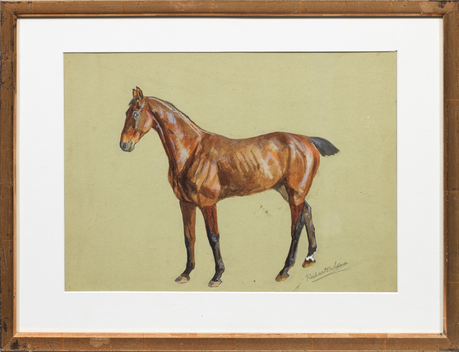 Fein ausgeführtes Tierbild Adams, der seit 1896 höchst lebendige Pferdeporträts für den deutschen, österreichischen, böhmischen und ungarischen Adel ausführte. Um 1897 war er Sommergast im bayerischen Possenhofen, wo er ein Gruppenbild mit Kaiserin Elisabeth von Österreich ("Sissi") malte. 1899 folgte die sog. Budapester Jagdgesellschaft aus 47 Pferdeporträts. Gouache/helles, graugrünes Papier. R. u. sign.; Ca. 24 cm x 34 cm (Passepartoutausschnitt). Rahmen.