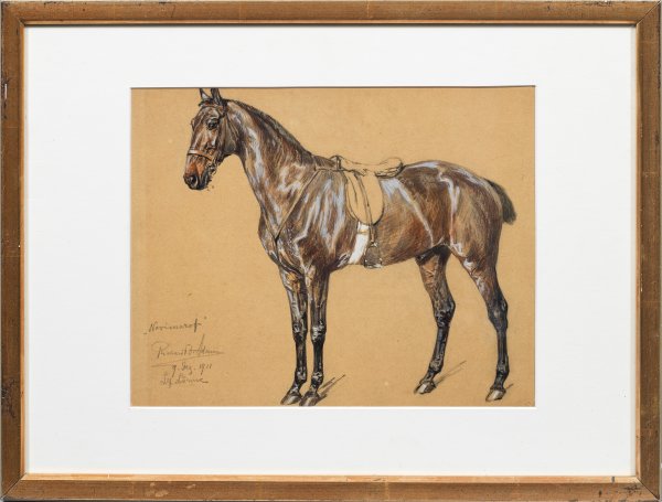 Fein ausgeführte, höchst lebendige Tierdarstellung Adams, der seit 1896 Pferdeporträts für den deutschen, österreichischen, böhmischen und ungarischen Adel ausführte. Um 1897 war er Sommergast im bayerischen Possenhofen, wo er ein Gruppenbild mit Kaiserin Elisabeth von Österreich ("Sissi") malte. 1899 folgte die sog. Budapester Jagdgesellschaft aus 47 Pferdeporträts. Gouache/hellbraunes Papier. L. u. sign., betitelt u. dat. 9. Dez. 1911 mit undeutlicher Ortsangabe. 22,7 cm x 29 cm (Passepartoutausschnitt). Rahmen.