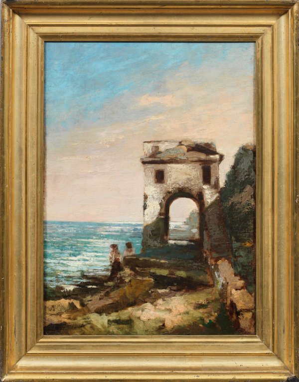 In zartrosafarbenes Abendlicht getauchter Blick von der Küstenstraße mit Torbogen auf das ruhig daliegende Ligurische Meer, das von zwei Wäscherinnen betrachtet wird. Äußerst stimmungsvolles, impressionistisch angelegtes Gemälde, charakteristisch für das Oeuvre Arthur Calames, der Schüler bei seinem Vater Alexandre Calame war. 1864-1867 studierte er in Düsseldorf bei Oswald Achenbach, der ihn künstlerisch nachhaltig prägte. Wie Achenbach schilderte auch Calame die Landschaften aus Italien, der Bretagne und Normandie in impressionistischer Weise. Calames Intention war hierbei die Wiedergabe einer Gesamtstimmung. Öl/Lwd., doubliert. 54 cm x 37 cm. Rahmen.