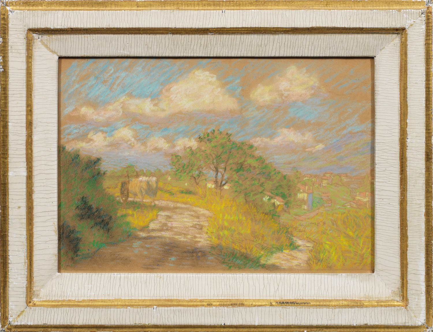 Südliche, lichtdurchflutete Landschaftsimpression mit Pferdegespann auf einem Feldweg vor tief gelegener Dorfkulisse. Die leuchtenden Farben mit breitem, dynamischem Duktus aufgetragen und durch eine effektvoll inszenierte Lichtführung in Szene gesetzt. Diese äußerst stimmungsvoll gestimmte Momentaufnahme steht ganz in der Tradition der impressionistischen Freilichtmalerei, wie sie von namhaften Künstlern wie Camille Pissarro, Claude Monet, Pierre-Auguste Renoir oder Alfred Sisley praktiziert wurde. Pastell/Papier. Verso auf Papieretikett bez. "...Melle. Barbot Renée La Vigellerie Gast"(?) sowie Hinweis auf den Künstler Odilon Redon mit handschriftlicher Datierung 1902. 24 cm x 34,6 cm. Rahmen.