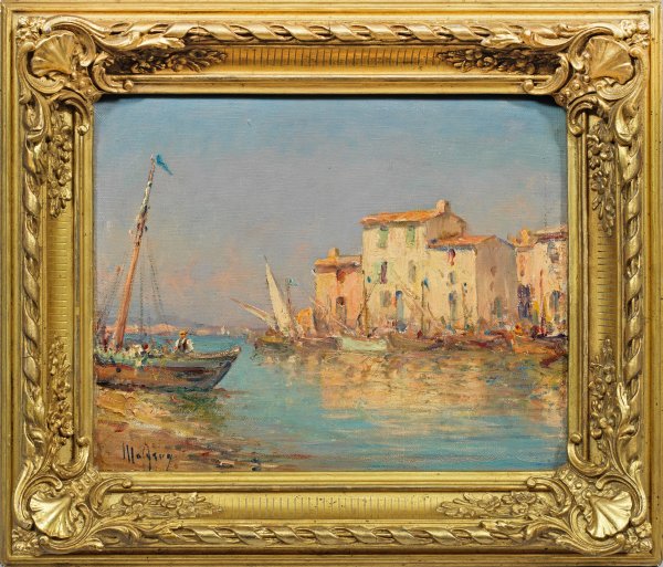 Unter wolkenlosem Himmel der Blick auf eine kleine, von zahlreichen Fischerbooten belebte Hafenstadt am Mittelmeer, wohl Martigues. Spätimpressionistische, mit breitem Pinselstrich und in virtuos wiedergegebenem Lokalkolorit gemalte, charakteristische Marineansicht des Künstlers. Henry Malfroy war vermutlich ein Sohn des Malers Charles Malfroy, mit dem er oft verwechselt wird, da er wie dieser mit Vorliebe die Mittelmeerorte der Departements Bouches-du-Rhône und Var an der provenzalischen Côte d’Azur malte. Henry Malfroy stellte regelmäßig im Salon des Artistes Français und im Salon des Indépendants in Paris aus. Öl/Lwd.; L. u. sign. 22 cm x 27 cm. Rahmen.