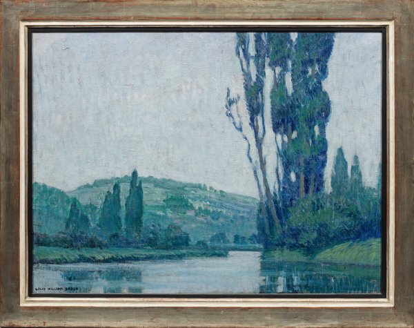 Stimmungsvolle, flächig komponierte, auf Grün- und Blautöne reduzierte Landschaftsimpression des französischen Malers, der an der École des Beaux-Arts in Paris bei Ernest Laurent, Auguste Leroux, Luc Olivier Merson und Henry Grosjean ausgebildet wurde. Ab 1908 stellte er u.a. im Salon des Artistes Français aus und wurde mehrfach prämiert, u. a. 1928 mit einer Goldmedaille. Die Motive seiner Landschaften fand er in Schottland, dem Herkunftsland seiner Mutter, aber auch in der Bretagne und in Burgund. Als einfühlsamer Kolorist bereits von seinen Zeitgenossen gefeiert, schuf er in seiner Malerei eine zarte und nuancierte Harmonie mit einem erstaunlichen Reichtum an matt schimmernden Halbtönen. Öl/Lwd.; L. u. sign.; Verso auf Papieretiketten unleserlich bzw. geschwärzt bez.; 60 cm x 81 cm. Rahmen.