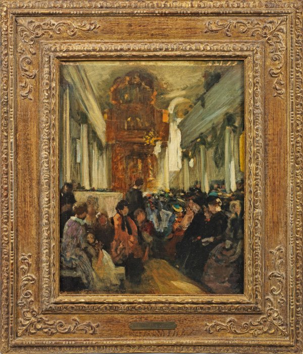 Impressionistische Ansicht einer kleinen, dicht mit Menschen besetzten Kirche. Kuehl studierte an der Dresdener und Münchener Akademie, nach seiner ersten Begegnung mit dem französischen Impressionismus 1873 auf der Wiener Weltausstellung wurde er 1878-1889 selbst in Paris ansässig. 1895 berief man ihn als Professor an die Akademie in Dresden. Sein Oeuvre umfasst außer stillen Interieurs, Genreszenen und Dresden-Ansichten auch eine Reihe von teilw. belebten Kircheninterieurs aus verschiedenen Städten, in denen er die Licht- und Farbstimmungen einfing. Kuehl gilt als bedeutender Vertreter des frühen deutschen Impressionismus. Öl/Lwd., auf Hartfaser kaschiert. Verso auf dem alten Keilrahmen bez. "Kuehl Gotthard". 50 cm x 40 cm. Rahmen.