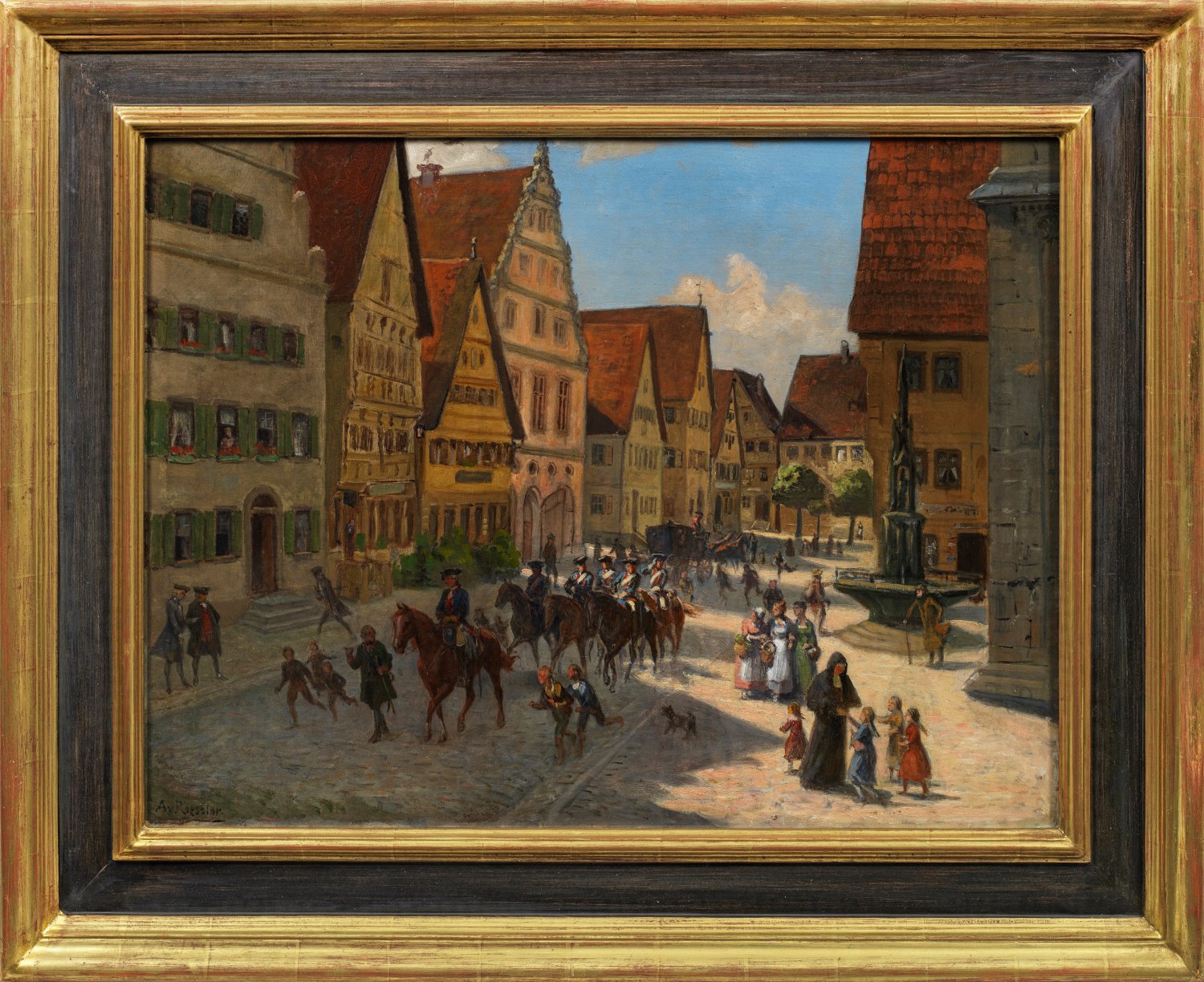 Historische Genremalerei, die eine herrschaftliche Kutsche mit ihrem Reitertross beim Einzug in eine Stadt zeigt. Ausstattung und Kostüme versetzen den Betrachter in das Zeitalter Friedrichs des Großen und des deutschen Rokoko. Lebensnah empfundene Nebenszenen, wie die drei mit vollen Körben vom Markt zurückkehrenden Frauen und die tollenden Kinder, vermitteln den Eindruck eines unmittelbar beobachteten Ereignisses. Von Roessler war ein Schüler Anton von Werners. Große Darstellungen mit vielen Figuren in historisch korrekter Kostümierung kennzeichnen seine besten Werke. Öl/Lwd.; L. u. sign.; Verso auf einem alten Papieretikett in Dänisch bez.; 60 cm x 81 cm. Rahmen.
