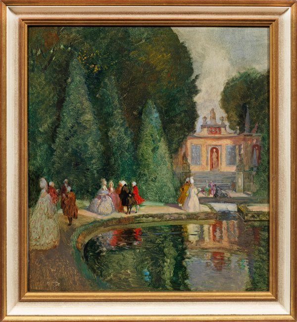Vor dicht bewaldeter Parkkulisse mit Teich und verspielter Treppenarchitektur die heitere, in ausgelassenen Unterhaltungen vertiefte, höfische Gesellschaft. Mit breitem Pinselduktus, in lichten Farben gemalte, charakteristische Genreszene des bei Knirr und an der Académie Julian unter B. Constant und J.P. Laurens ausgebildeten Künstlers. Walter Geffcken malte Porträts, Genreszenen und Stillleben, besondere Beliebtheit erfuhren seine, in der "Jugend" veröffentlichten Rokoko-Gesellschaften. Öl/Malkarton (Malwarenstempel von Winsor & Newton, London). L. u. sign. u. dat. 1908. 51,4 cm x 46,8 cm. Rahmen.