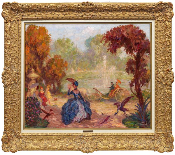 Wohl Szene im Garten von Schloss Belvedere in Wien als Szenerie. Im Vordergrund eine höfische Dame mit Sonnenschirm, flankiert von südlichen Vögeln, weiteren Damen und einer Kutsche, im Hintergrund ein Brunnenbassin. Motiv- und stiltypisches, in impressionistischer Weise mit weich-pastosem Duktus gemaltes Werk des Künstlers. Pellar studierte 1906-1908 bei Franz v. Stuck in München; 1911-1917 war er Mitglied der Künstlerkolonie Darmstadt. Mit Vorliebe schilderte Pellar, der als "Maler der Eleganz" galt, in fantasievoller Weise Märchenmotive, überdies Parkgesellschaften und oft erotisch aufgeladene, kokette Rokoko-Damen mit extravaganten Frisuren. Öl/Hartfaser. R. u. sign.; 49,5 cm x 59,5 cm. Rahmen.