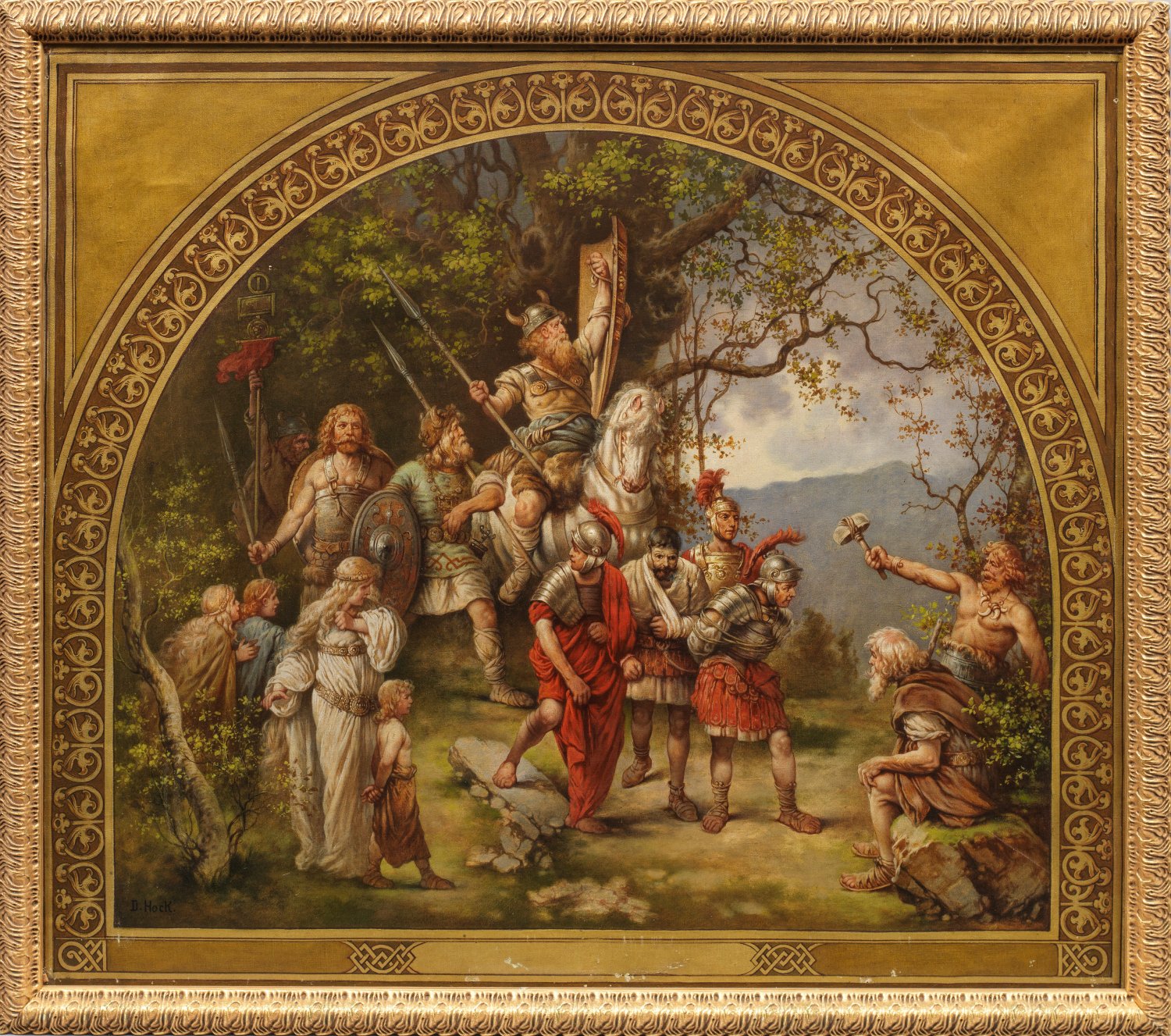 Szenische Darstellung in gemaltem, halben Tondorahmen, an einer Waldlichtung zwischen Eichen und Birken ein Trupp Teutonen mit bewaffnetem Anführer zu Pferd, vier besiegte Römer vor sich hertreibend, beidseitig flankiert von schaulustigen teutonischen Männern, Frauen und Kindern. Stiltypisches Werk des Historien- und Genremalers Hock, der als Schüler der Wiener Akademie unter F. J. W. Laufberger und A. Eisenmenger auch in London ausstellte. Öl/Lwd.; L. u. sign.; 62 cm x 72 cm. Rahmen.