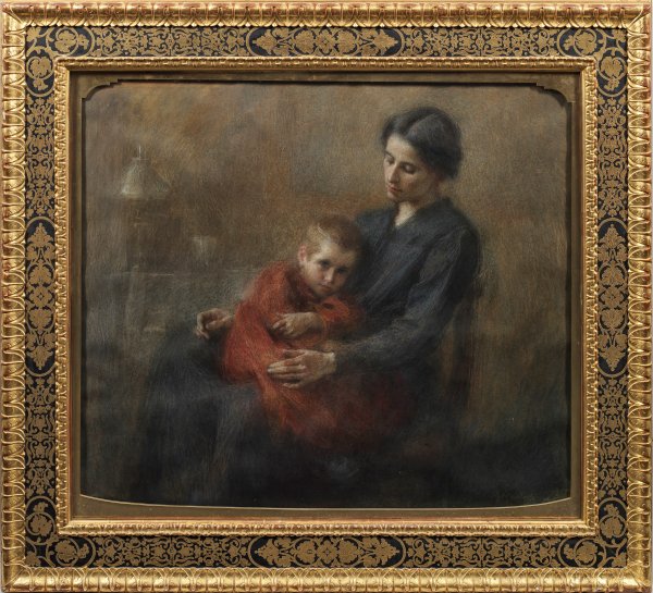 Symbolistische, um 1900 geschaffene Interieurszene des bedeutenden italienischen Malers. Der Künstler hatte selbst eine enge Bindung zu seiner Mutter, mit der er sein ganzes Leben sowohl in Ferrara als auch in Mailand verbrachte, so dass dieses vorliegende Werk auch persönliche Bezüge hat. Mentessi studierte an der Kunstschule in Ferrara, an der Akademie der Schönen Künste in Parma und schließlich an der Brera-Akademie in Mailand. Seit 1882 nahm er an den jährlichen Ausstellungen der Brera-Akademie teil. Als er 1895 zur 1. Biennale von Venedig eingeladen wurde, beschickte er danach bis 1914 alle weiteren Ausstellungen (mit Ausnahme der Biennale von 1910). Um 1900 übte er auch eine intensive Tätigkeit als Illustrator aus. Zugleich schuf er Wandbilder und Gemälde für Villen, Kapellen und Kirchen. Werke Mentessis befinden sich in den Sammlungen zahlreicher bedeutender Museen in Ferrara, Florenz, Mailand, Rom und Venedig. Pastell/Papier. R. u. sign.: Verso auf dem Rückenkarton wohl eigenhändig vom Künstler bez. mit dessen Adresse. 99 cm x 115 cm. Original-Rahmen.