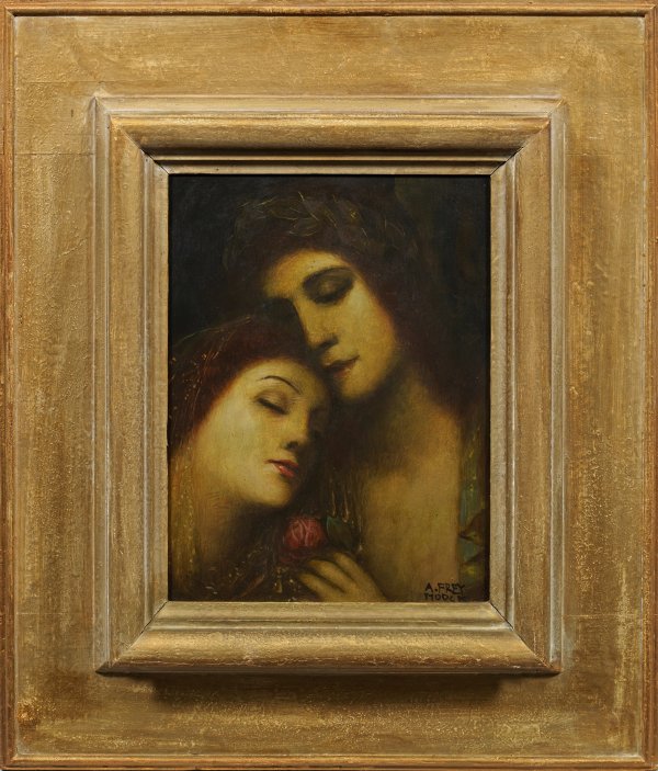Ausschnitthafte, auf die beiden Köpfe und eine rote Rose als Liebessymbol konzentrierte Komposition. Das in vorwiegend tonigem Kolorit gemalte Werk gehört zu den stiltypischen, symbolistischen Gemälden des Schweizer Malers. Inspiriert wohl weniger durch die Oper Richard Wagners, denn durch die mittelalterliche Erzählung selbst und die Gemälde der Präraffaeliten. Frey-Moock ging 1902 nach München, wo er seit 1904 an der Akademie bei Karl Raupp und Wilhelm von Diez studierte und 1904 Assistent von Franz von Stuck wurde. In seinen Werken wurde er intensiv sowohl durch Stuck als auch von Arnold Böcklin beeinflusst. Öl/Holztafel. R. u. sign.; Ca. 45,5 cm x 35 cm. Original-Rahmen.