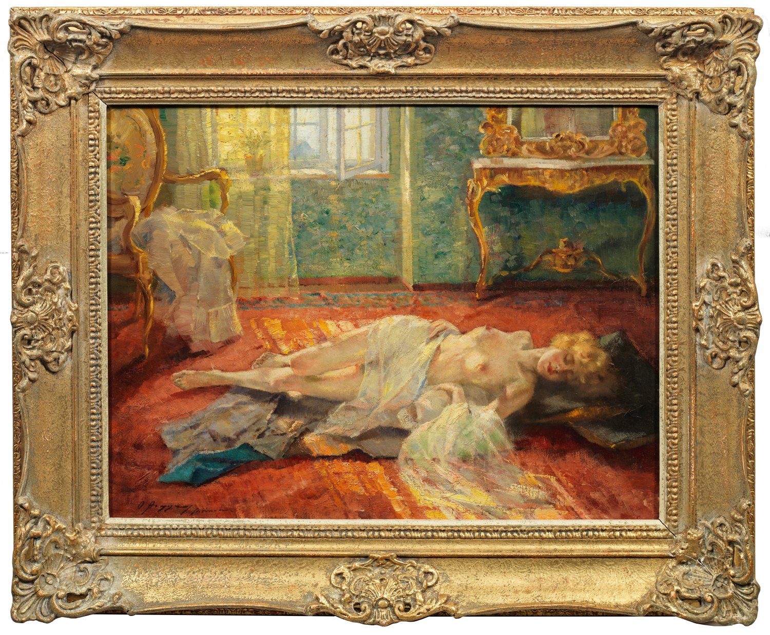 Impressionstische, in hell leuchtendem, pastelltonigem Kolorit gemalte Szene, bei der durch ein geöffnetes Fenster Sonnenstrahlen auf den höchst sinnlich geschilderten, am Boden liegenden Akt einer jungen, blonden Frau fallen. Argyros gehört zu den bedeutendsten griechischen Malern des Impressionismus. Er studierte seit 1900 an der Kunsthochschule in Athen bei Nikiforos Lytras and Georgios Roilos, 1906-1911 an der Münchener Akademie bei Carl von Marr und Ludwig von Löffz an der Akademie in München. Dort beschickte er seit 1913 die Glaspalast-Ausstellungen, weibliche Schönheiten und Aktmotive in Interieurs wurden zu Hauptsujets. Erst 1929 kehrte Argyros nach Griechenland zurück, man berief ihn als Professor an die Akademie nach Athen, wo er bis 1953 kehrte und zeitweilig deren Direktor war. 1934 und 1936 nahm Argyros an den Biennalen von Venedig teil, 1952 wurde Argyros mit der Nationalen Kunstmedaille ausgezeichnet, 1959 als ständiges Mitglied in die Akademie von Athen berufen. Öl/Lwd.; L. u. sign. mit Ortsangabe München. 56 cm x 75 cm. Rahmen.