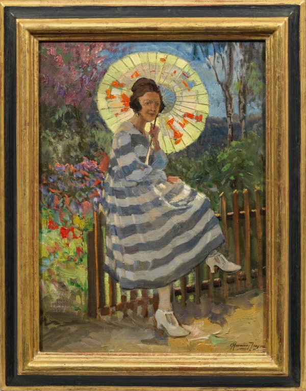 Impressionistisch angelegte, farbenfrohe Darstellung einer Frau mit japanischem Papierschirm, angelehnt an einen Zaun, in sommerlich blühendem Garten. In Stil und Motiv charakteristisches Werk Hornung-Jensens, der 1904 -1906 an der Akademie in Kopenhagen studierte und anschließend seine Studien in Paris fortsetzte, zunächst bei Christian Krohg und Frits Thaulow an der Akademie Colarossi und dann an der École Nationale des Beaux-Arts bei Gabriel Ferrier und Leon Bonnat. Während seiner Pariser Zeit machte sich Hornung-Jensen mit der impressionistischen Freilichtmalerei und der naturalistischen Arbeitsweise betraut. Sein Oeuvre umfasst neben Porträts auch Genremotive und Landschaften, die er in der Tradition der Naturstudien der sog. "Dyrehavemaler" schuf. Öl/Lwd.; R. u. sign.; 43 cm x 32 cm. Rahmen.