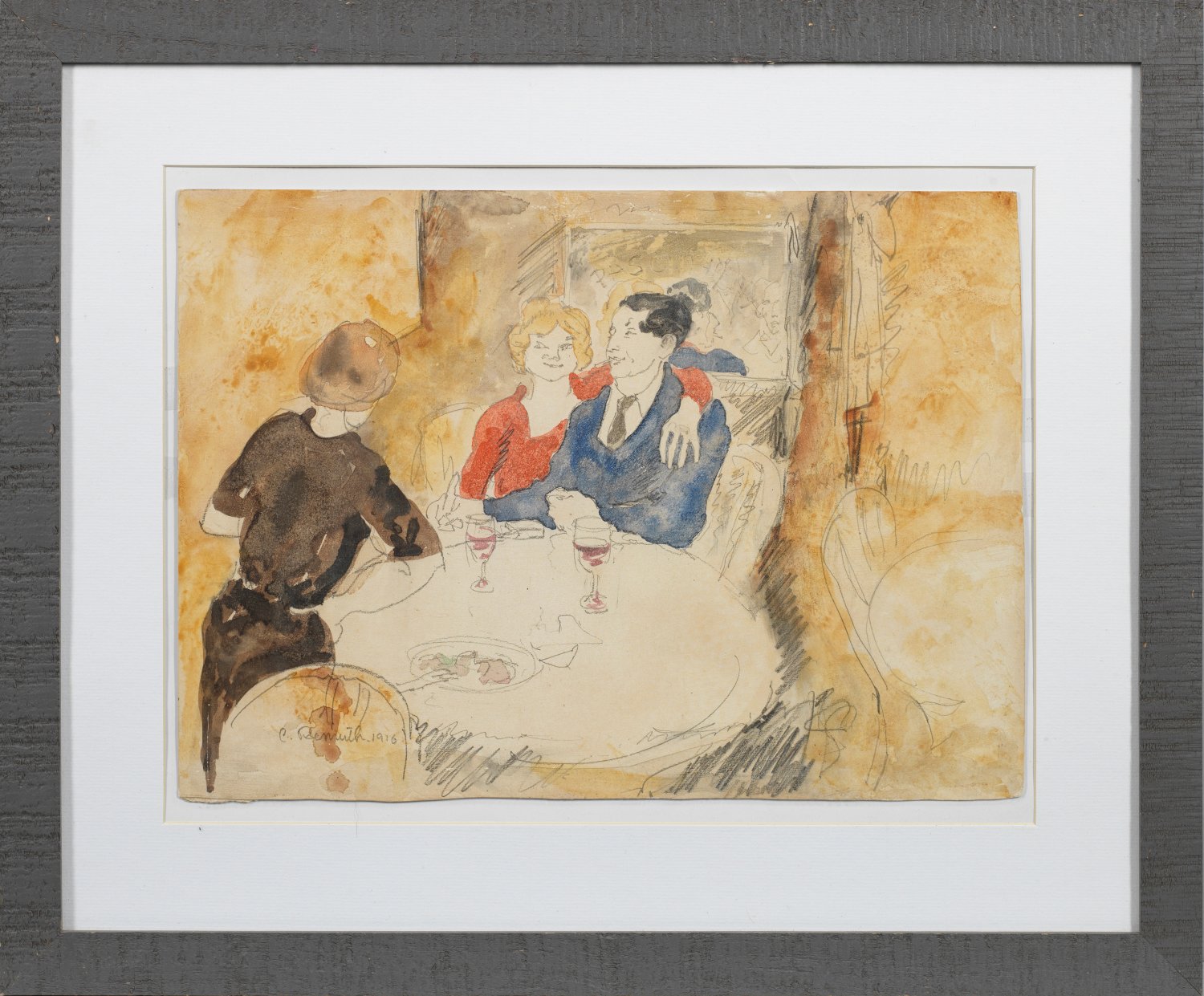 Mit schwungvollem Strich geschaffene Momentaufnahme eines Paares in einem Straßencafé. Auf der Glasscheibe, hinter der Gäste im Inneren des Cafés zu sehen sind, steht "Pascin in N.Y.C." geschrieben, vermutlich eine Anspielung darauf, dass es sich bei dem Dargestellten um den Maler Jules Pascin (1885 - 1930) handelt, der 1914 - 1920 zusammen mit seiner Ehefrau in den USA verweilte. Demuth und Pascin könnten sich aber bereits ein paar Jahre zuvor in Paris begegnet sein, wo sie den Umgang in denselben Kreisen pflegten und lernten, denn nachdem Demuth zunächst am Drexel Institute und an der Pennsylvania Academy of Fine Arts in Philadelphia studierte, ging er anschließend nach Paris, wo er Schüler an der Académie Colarossi und der Académie Julian wurde und im Salon von Getrude Stein verkehrte. Dort machte er auch Bekanntschaft mit seinem Landsmann Mardsen Hartley, der ihn an den einflussreichen Galeristen und Fotografen Alfred Stieglitz vermittelte. In dessen New Yorker Intimate Gallery fand 1926 Demuths erste Einzelausstellung statt. Bleistift und Aquarell/leichter Karton. L. u. sign. und dat. 1916. Auf der Glasscheibe im Hintergrund bez.; Verso bez. "AB Art Gallery N. Y. / Charles Demuth 1883 - 1935 / 'Pascin in N.Y.C' 1916.". Blatt 27 cm x 38,3 cm. Rahmen.