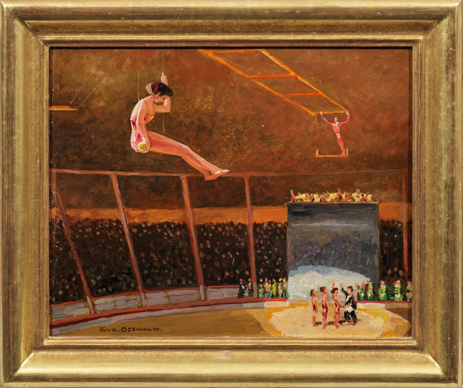 Impressionistische, durch effektvolle Lichtführung inszenierte Zirkusszene Osswalds, der an der Münchner Akademie bei Angelo Jank und Heinrich von Zügel studierte und sich vorwiegend der Tiermalerei widmete. Nach Abschluss seines Studiums ging er für einige Monate nach Paris; Studienreisen führten ihn zudem in den Nahen Osten. Zeitweise schloss er sich einem Zirkus an, um seine Tiermalerei durch Studien zu vervollkommnen. Öl/Masonit. L. u. sign.; Verso betitelt sowie Ausstellungsnummer (Papieretikett). 51 cm x 60 cm. Rahmen.