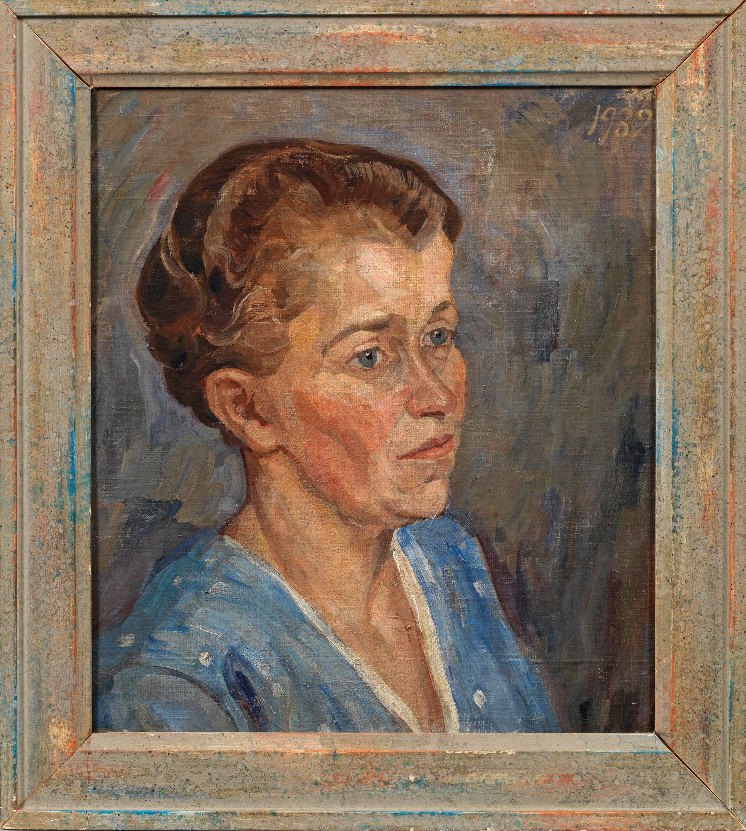 Im Stil der Neuen Sachlichkeit gemaltes, typisches Porträt des bekannten Malers, der bei Franz v. Stuck in München und Lovis Corinth in Berlin studierte. Heitmüller, der 1908 nach Hannover zurückging, gehörte 1917 zusammen mit Kurt Schwitters zu den Mitbegründern der Hannoverschen Sezession. Öl/Lwd., kaschiert a. Platte. R. o. dat. 1932. Verso auf einem Etikett bez. und dat. "Damenbildnis (Fragment) / Öl - Leinw. auf Pappe/ (gemalt 1932 von August Heitmüller)". 43 cm x 38 cm. Rahmen.