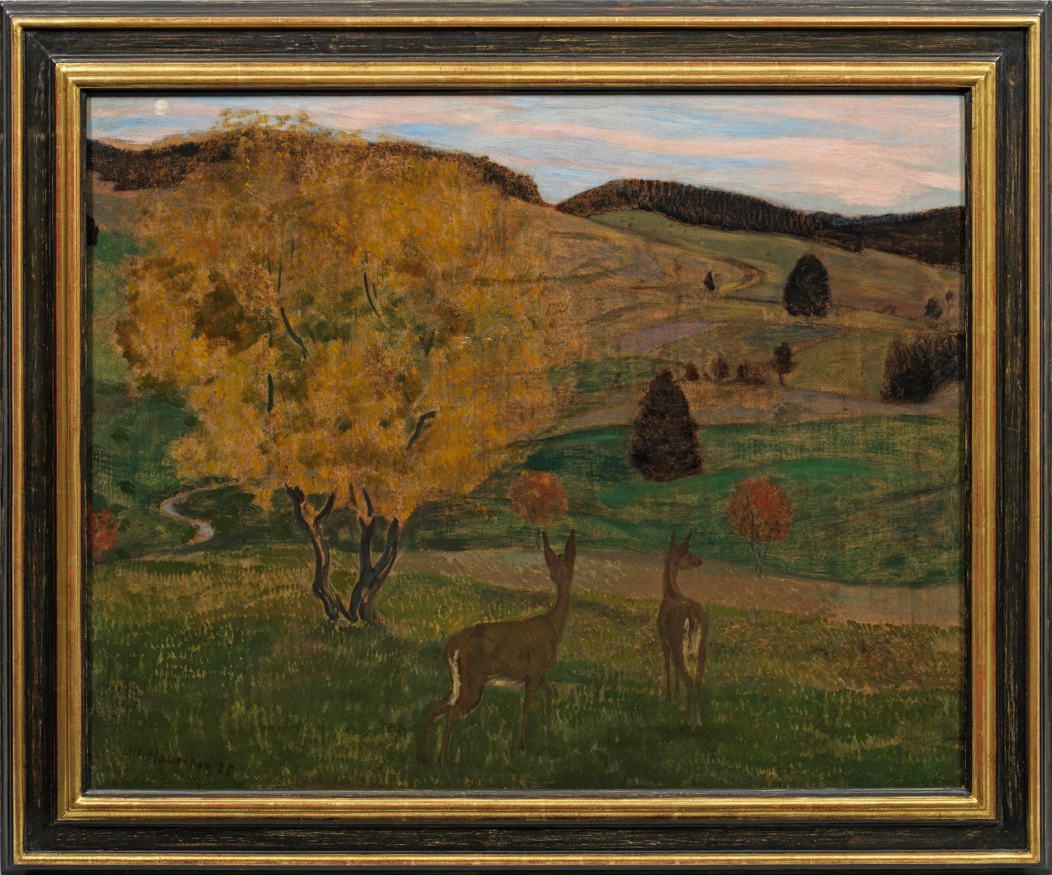 Äußerst stimmungsvolle, in weichem, lasierendem Duktus und erdigem Kolorit gemalte Schwarzwaldlandschaft mit zwei Rehen auf einer Lichtung in den Morgenstunden. Haueisen studierte an der Akademie in Karlsruhe bei v. Kalckreuth und Hans Thoma. Sein künstlerischer und stilistischer Werdegang verlief sehr vielfältig und bezeugt unterschiedliche Einflusssphären, von den Altmeistern über Manet, zu Cézanne, Hodler und seinem Künstlerfreund Trübner. Öl/Holztafel. L. u. sign. u. dat. (19)05. 76,5 cm x 98 cm. Rahmen.